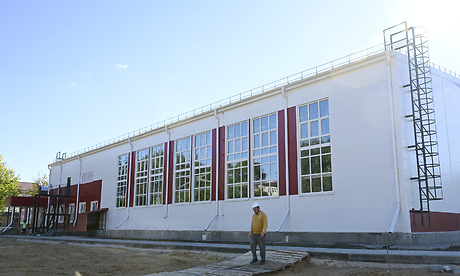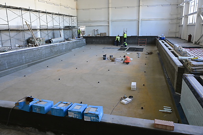 Объект должны сдать до конца года, сейчас техническая готовность — около 75%. Чаша бассейна проходит испытания на герметичность. Установлены оконные и дверные блоки, выполнены работы по монтажу отопления, электроснабжения. Смонтирована кровля, выполнены работы по прокладке наружных сетей водоснабжения, водоотведения. До конца сентября должна поступить блочно-модульная котельная.