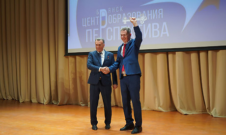 Я признателен застройщику, Михаилу Афанасьевичу Кабанову, кто построил уже четвертую школу в Брянске. Это действительно большой труд, он делает эту работу и никогда не подводил. Мы его тоже ценим, уважаем. Он у нас единственный в Брянской области Герой Труда!
