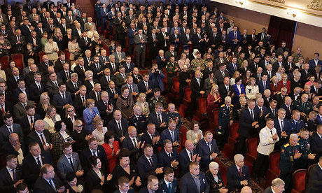 В зал были внесены Конституция Российской Федерации и Устав Брянской области, а также символ Губернаторской власти Брянской области — Знак Губернатора Брянской области.