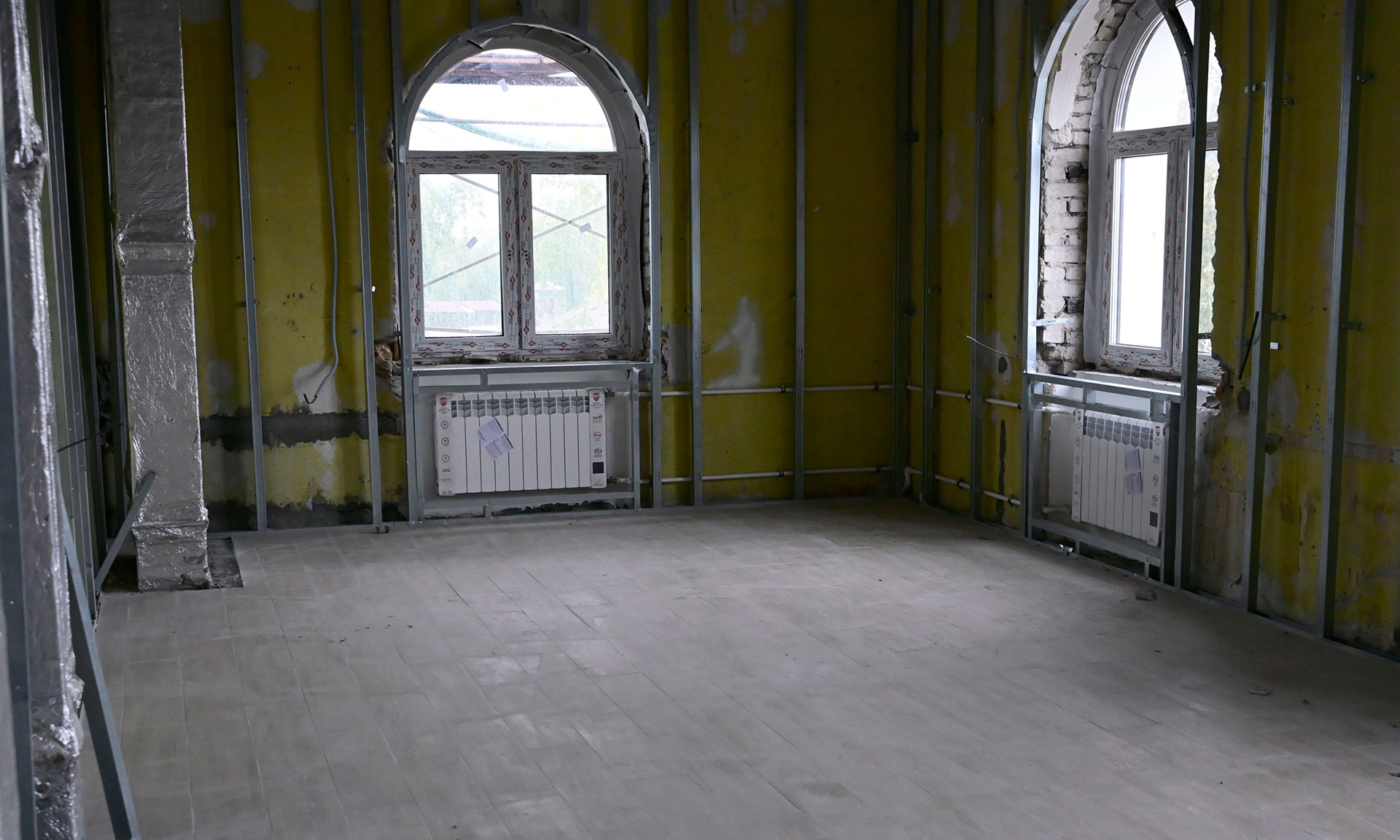 Во всем здании учебного корпуса идет чистовая отделка. Четвертый этаж уже через две недели будет готов — работы ведутся с верхних этажей здания. На всех этажах работают бригады в усиленном темпе. В декабре все четыре этажа планируется сдать, чтобы студенты уже могли заниматься в собственном здании.