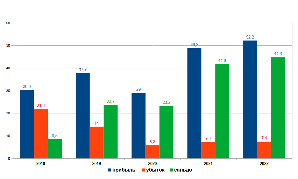 За 2022 год крупными и средними предприятиями и организациями области по всем видам экономической деятельности получен положительный сальдированный финансовый результат в сумме 44,8 млрд. рублей прибыли. Удельный вес убыточных предприятий в целом по области составил 26,1 процента.