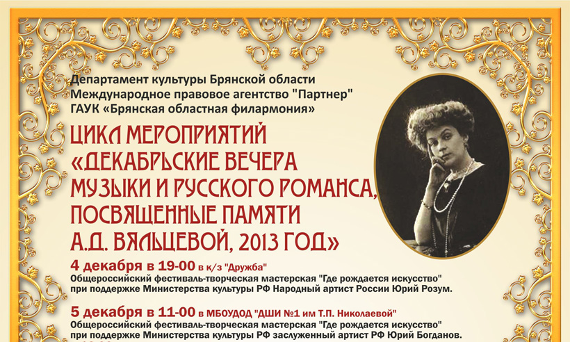 С 4 по 18 декабря при поддержке департамента культуры Брянской области, Международного правового агентства «Партнер» и Брянской областной филармонии пройдет цикл мероприятий «Декабрьские вечера музыки и русского романса, посвященные памяти А. Д. Вяльцевой, 2013 год».