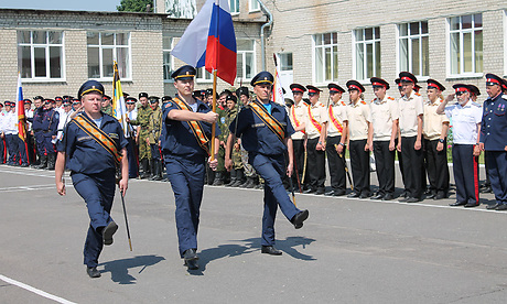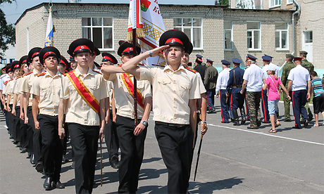 После проведения переклички, проверки готовности личного состава, осмотра формы и выправки казаки прошли строевым маршем по территории кадетского корпуса.