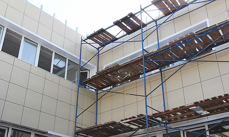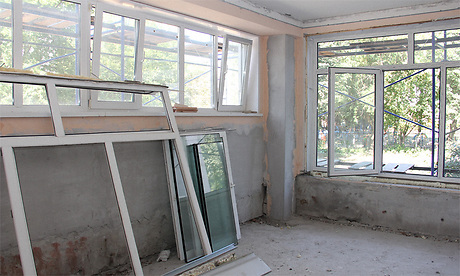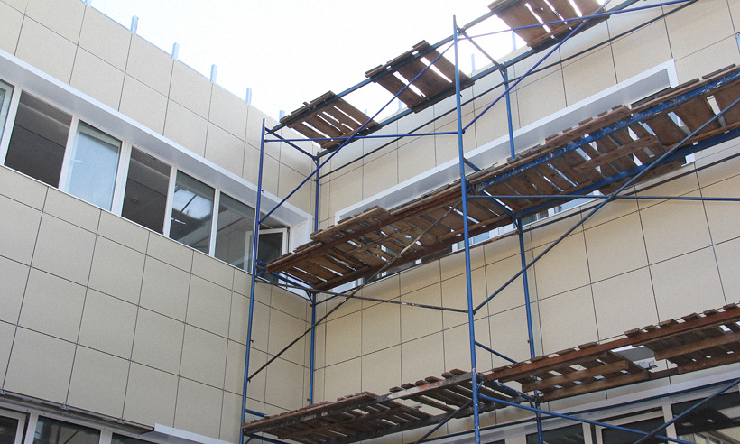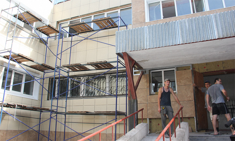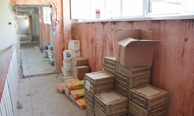 Работа идёт на всех этажах здания. Кровля заменена, сделана перепланировка, обновлены инженерные коммуникации, строители меняют окна, утепляют фасад.