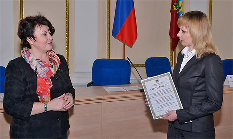 Заместитель Губернатора Ирина Кузьмина, председатель региональной Общественной палаты Андрей Антюхов, председатель комитета по вопросам социальной политики и здравоохранения областной Думы Валентин Пенюков в торжественной обстановке вручили сертификаты на получение грантов победителям конкурса.