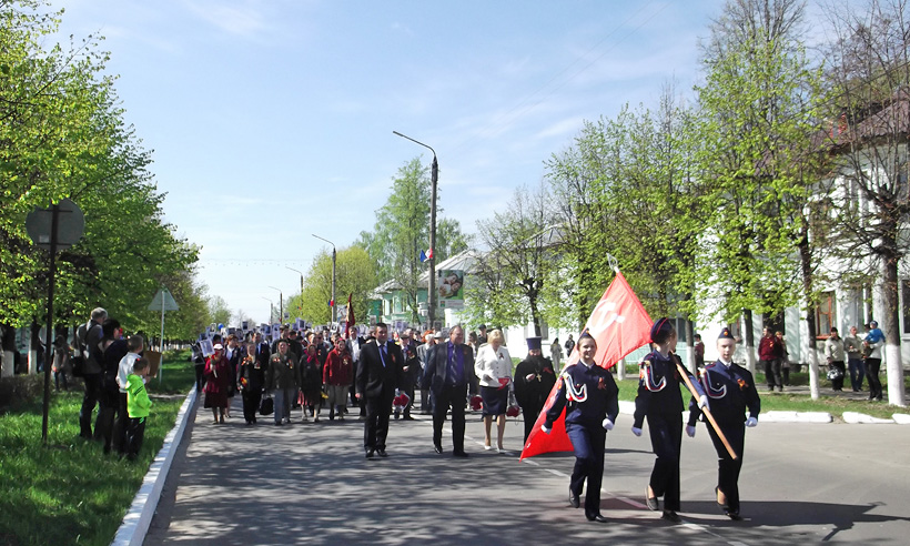 Под звуки духового оркестра старшеклассники развернули и понесли огромных размеров георгиевскую ленточку. В колонне, возглавляемой руководителями города, шли и ветераны. Седовласые, в орденах, еще бодро шагающие, они были для всех примером несгибаемой силы духа.