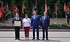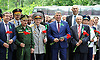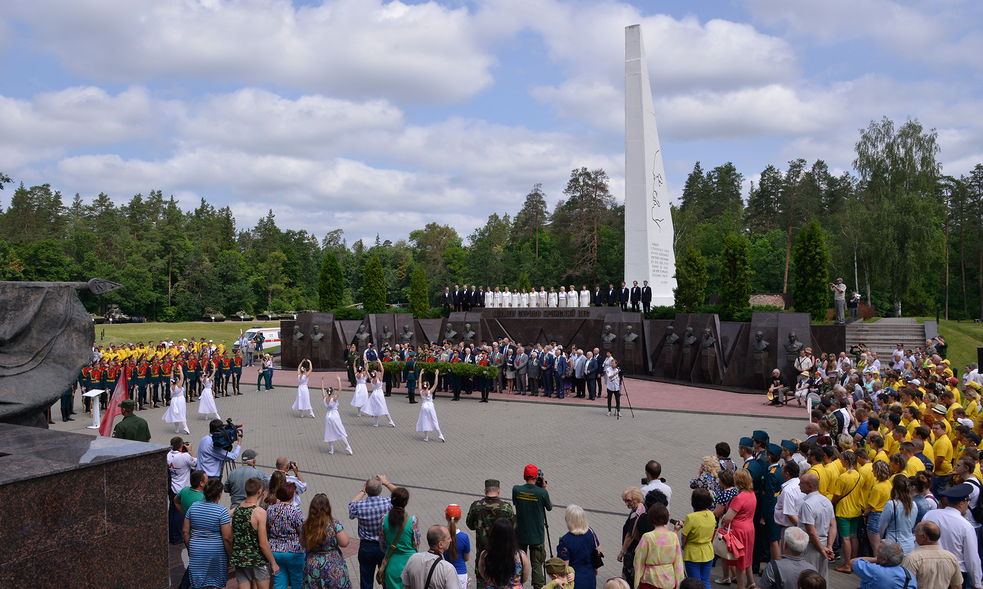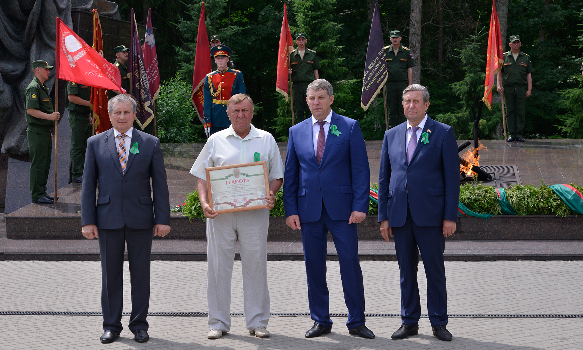 В знак памяти и благодарности за беспримерный подвиг партизан и подпольщиков, отдавших жизнь в борьбе с немецко-фашистскими захватчиками, к Вечному Огню военнослужащие роты Почетного караула возложили гирлянду Славы, руководители и гости — цветы.