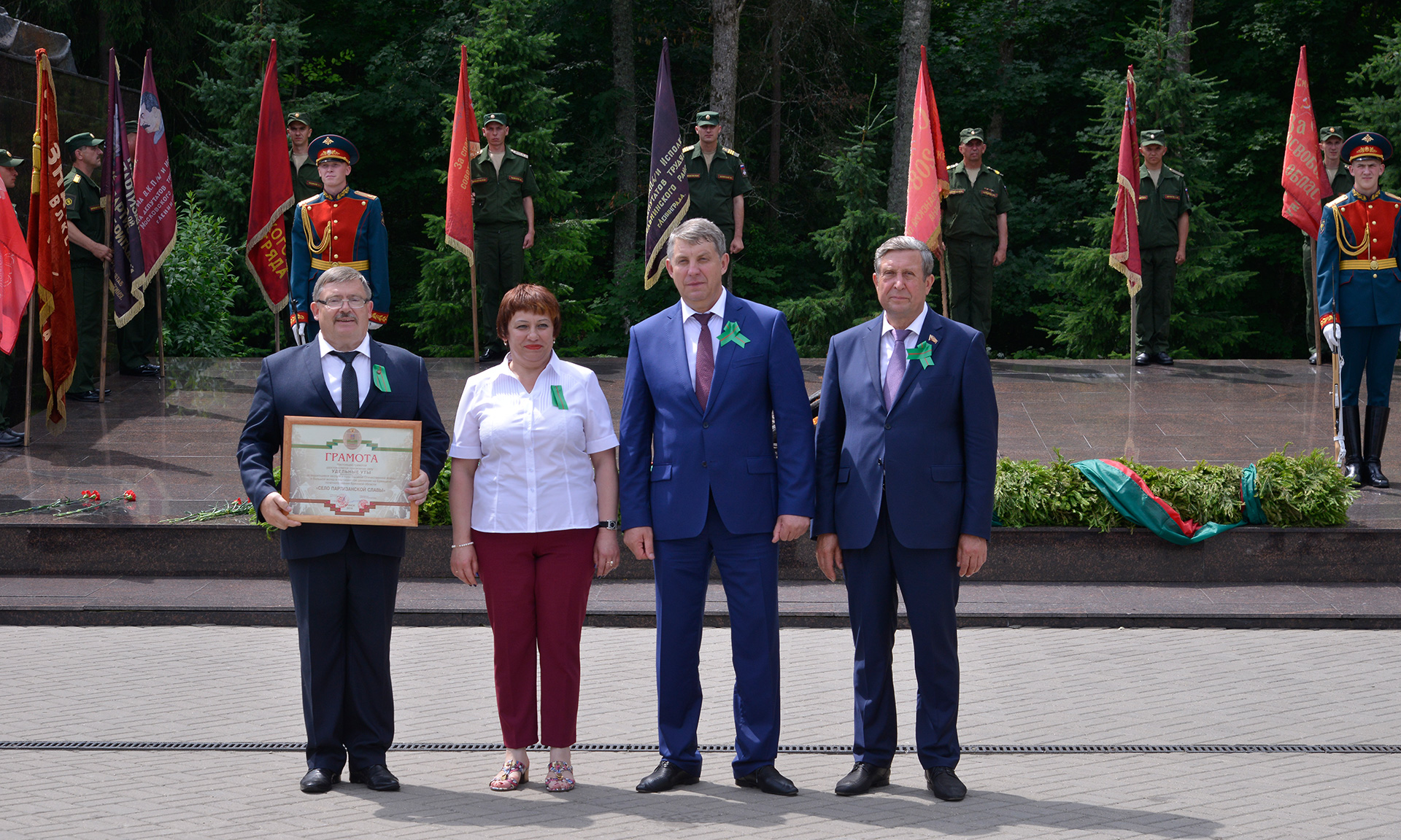 Затем состоялась торжественная церемония передачи грамот о присвоении почётных званий «Посёлок партизанской славы» и «Село партизанской славы» муниципальным образованиям Брянской области, которую провели Александр Богомаз и Владимир Попков.