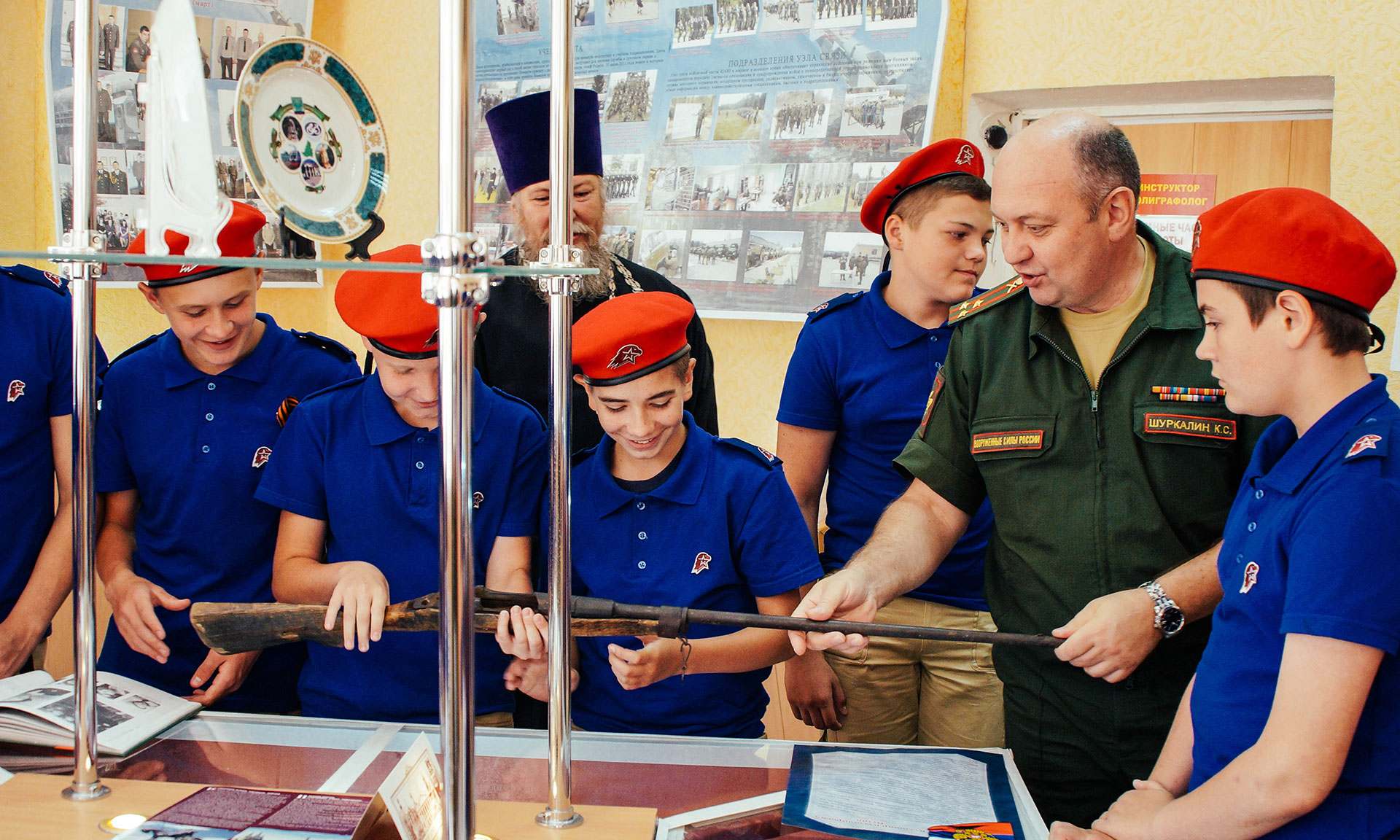 Духовное воспитание юнармейцев проводит помощник командира войсковой части 12 Главного управления Минобороны России по работе с верующими военнослужащими протоиерей Олег Кураж.