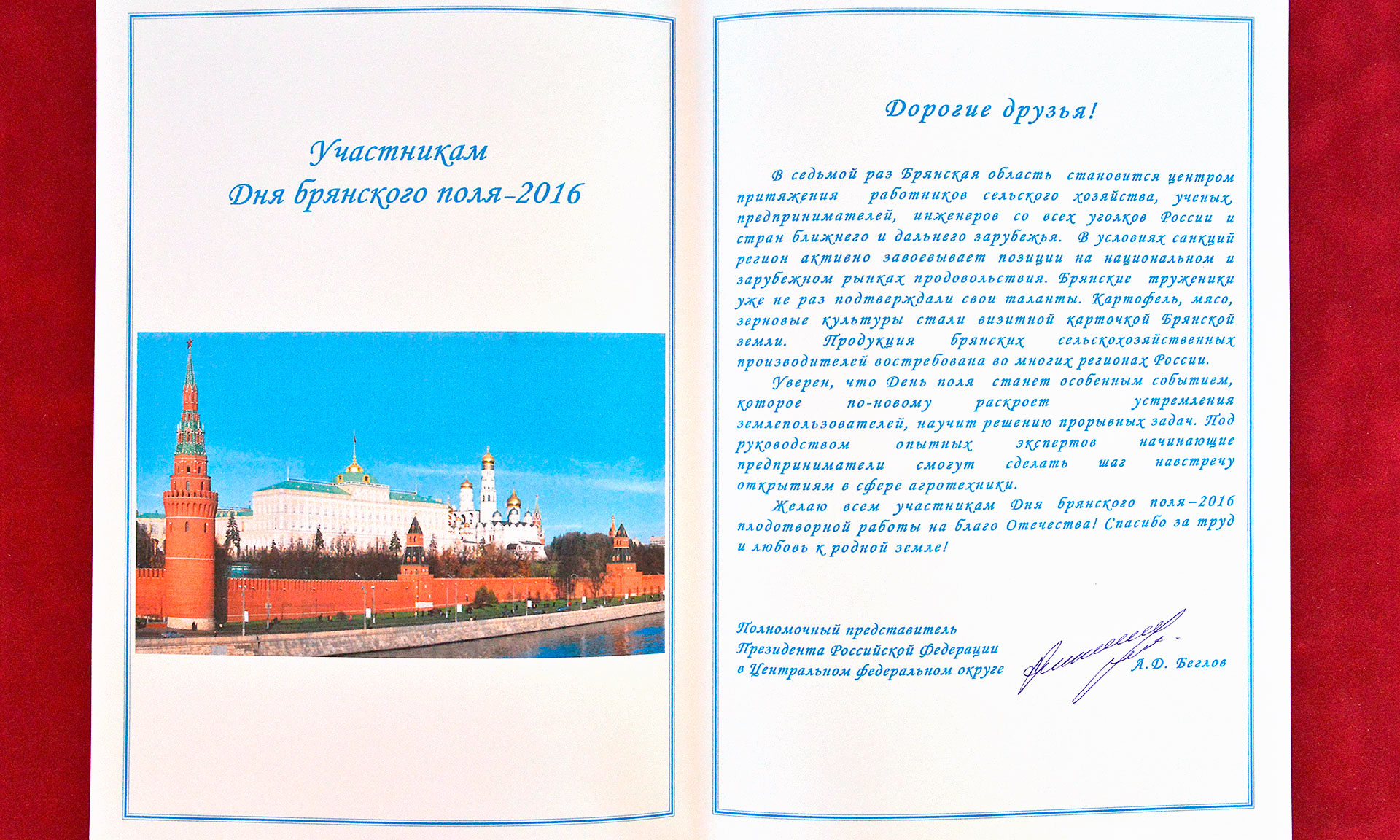 В завершение визита в Брянскую область полномочный представитель Президента РФ в ЦФО Александр Беглов вручил Губернатору Брянской области Александру Богомазу памятный адрес со словами благодарности в адрес участников Дня брянского поля-2016.