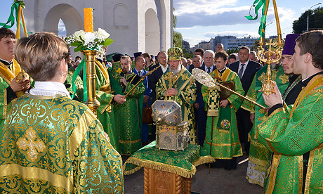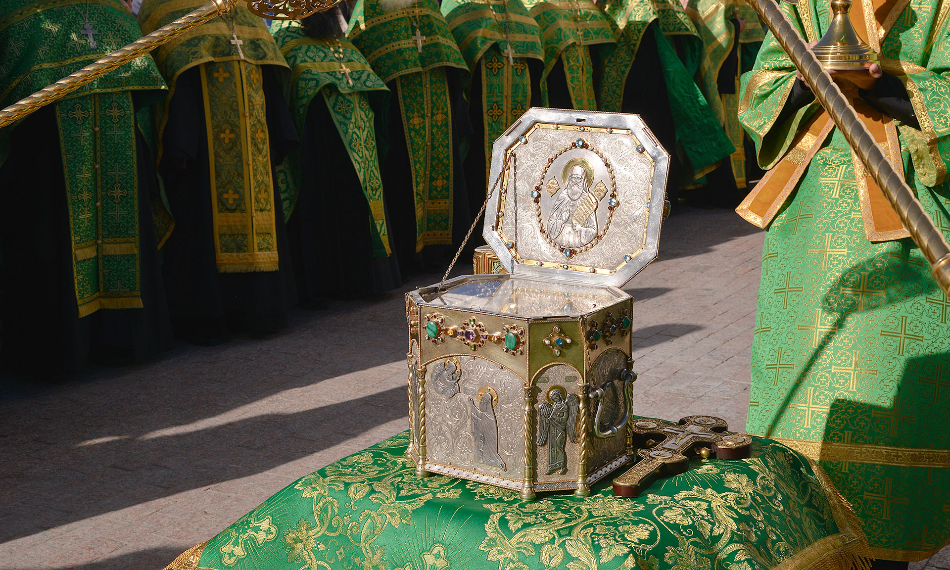 20 августа из Русского Пантелеимонова монастыря на Афоне, в котором хранятся мощи и из которого они до настоящего момента никогда не вывозились, святыня в сопровождении монахов была доставлена в Свято-Духов кафедральный собор в Минске. Затем начался российский этап принесения.