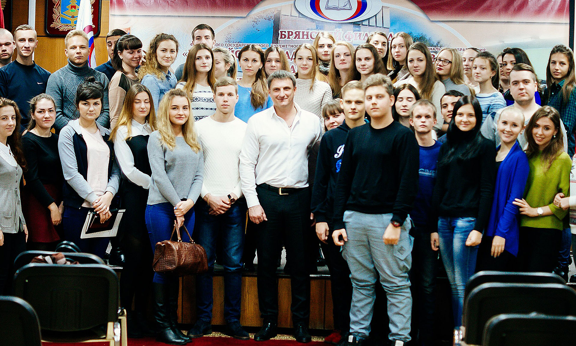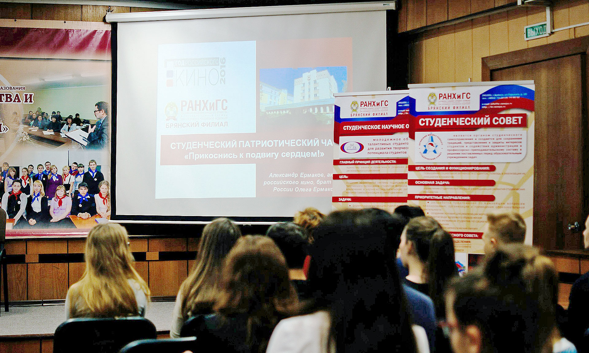 16 ноября Брянский филиал Российской академии народного хозяйства и государственной службы при Президенте Российской Федерации при поддержке управления молодежной политики и общественных проектов департамента внутренней политики Брянской области провел студенческий патриотический час «Прикоснись к подвигу сердцем!», посвященный Году кино в России.