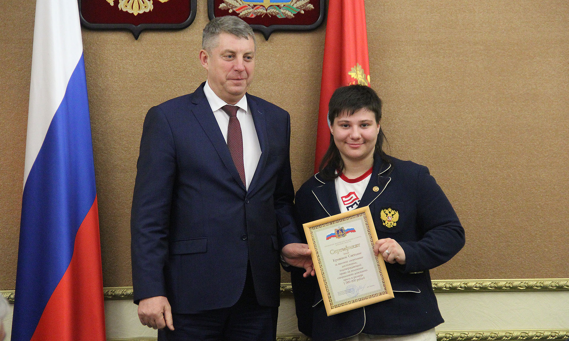 На недавней встрече главы региона со спортсменами-паралимпийцами Александр Богомаз заявил о том, что в Брянской области разработана система денежного поощрения чемпионов мирового уровня. На 32-м заседании Брянской областной Думы по инициативе Губернатора народные избранники единогласно приняли в трех чтениях проект закона Брянской области «О внесении изменений в Закон Брянской области «О физической культуре и спорте в Брянской области», согласно которому предусматриваются дополнительные возможности материального стимулирования брянских спортсменов и тренеров, достигших высоких результатов на различных соревнованиях.