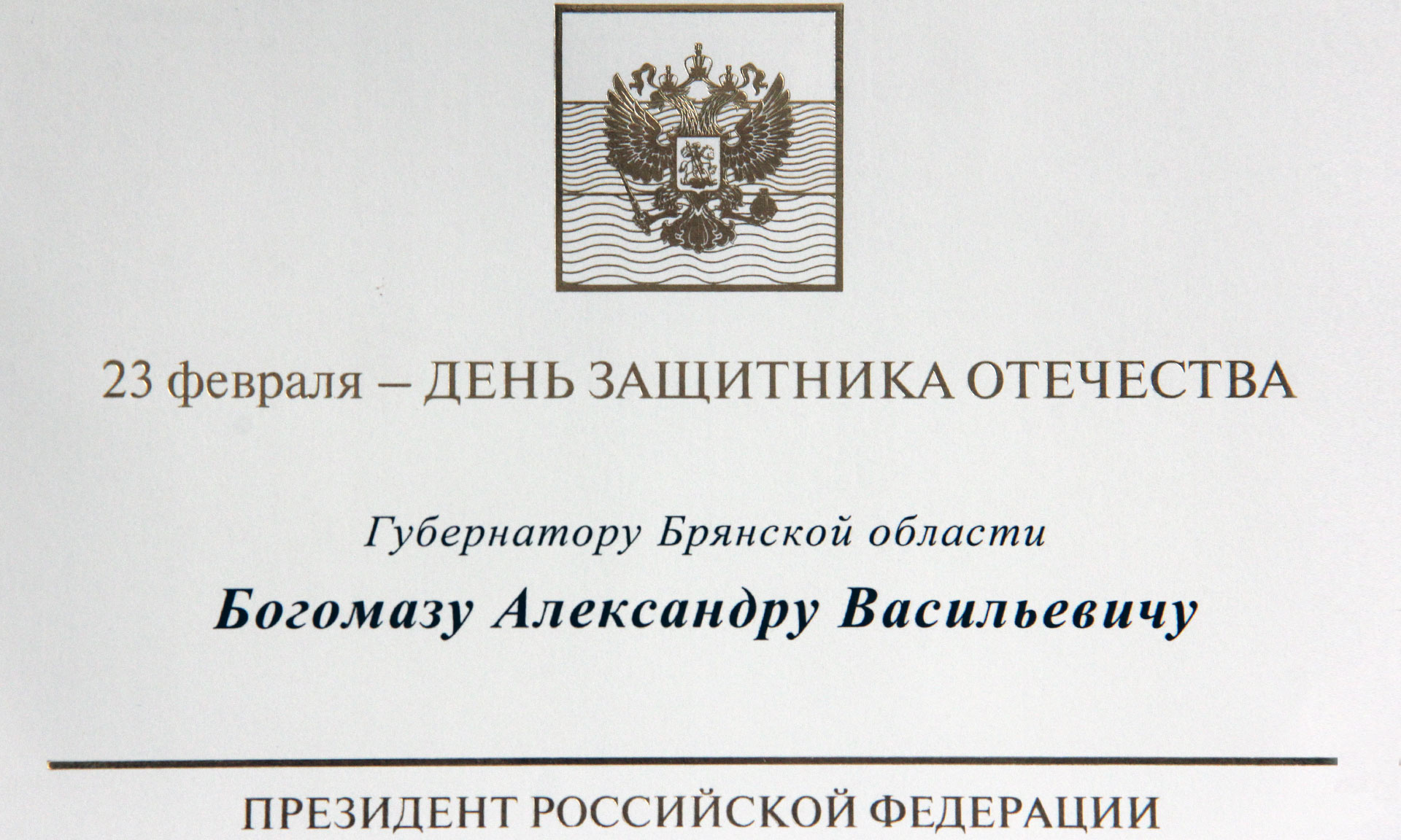 В адрес Губернатора Брянской области Александра Богомаза поступило поздравление с Днем защитника Отечества от Президента Российской Федерации Владимира Путина.