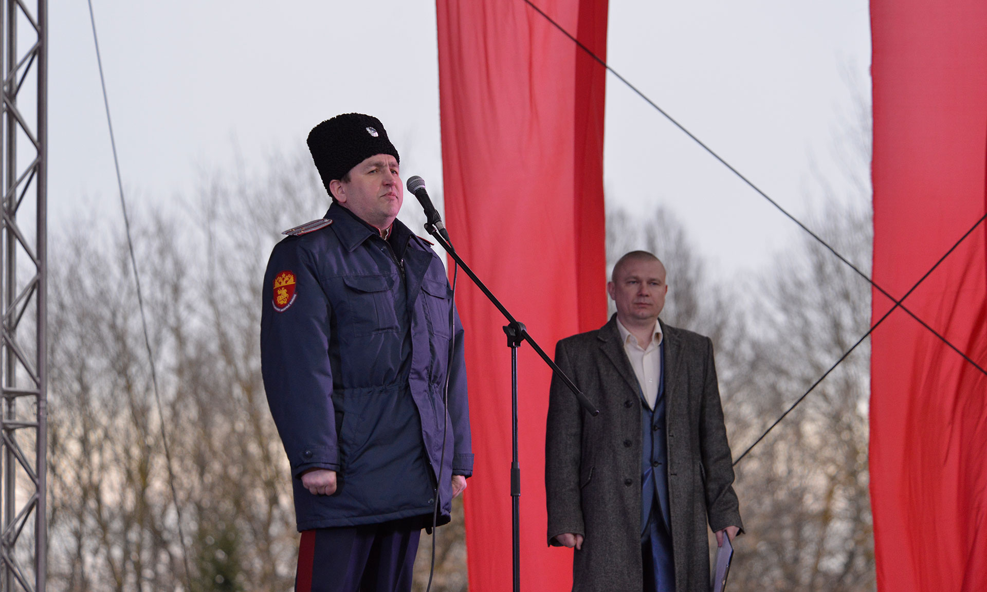 — Дорогие земляки! В соответствии с волеизъявлением жителей Крыма три года назад и благодаря решимости нашего Президента Владимира Владимировича Путина Крым вошел в состав Российской Федерации. Что такое для нас Крым? Это и Херсонес, колыбель нашей православной веры. Это и основатель Черноморского флота святой, праведный, непобедимый Федор Федорович Ушаков, который из 28 сражений не проиграл ни одного, мало того, не потерял ни одного корабля, а при Ушакове Черное море называлось Русским морем! Это и наши земляки с 34-го Севского и 35-го Брянского пехотных полков, которые во время Крымской войны 1853-1856 годов защищали Севастополь под командованием Павла Степановича Нахимова от англичан и французов. Пять тысяч наших земляков вместе с полковым священником Иваном Смирновым остались навсегда лежать в крымской земле за нашу Родину, за Россию! Это и 245-дневная оборона Севастополя во время Великой Отечественной войны, а руководил ею наш земляк генерал Петров Иван Ефимович. У нас общие корни, у нас одна история, у нас одно будущее и одно настоящее!