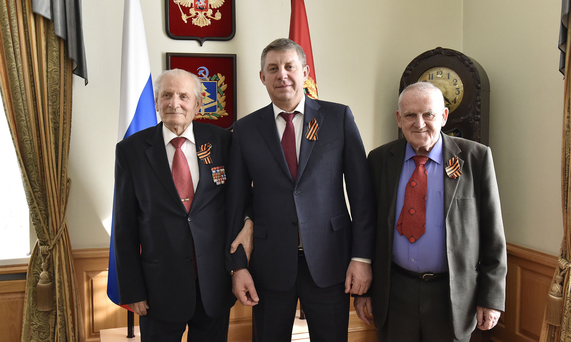 В начале встречи Сергей Алексеевич Панков рассказал Губернатору о старте акции «Георгиевская ленточка». Он подчеркнул, что это символ, который даже спустя десятилетия позволяет и старшему, и молодому поколению сохранить память о героическом подвиге нашего народа. Затем председатель Брянского областного Совета ветеранов войны, труда, Вооруженных Сил и правоохранительных органов лично закрепил Губернатору Георгиевскую ленточку.