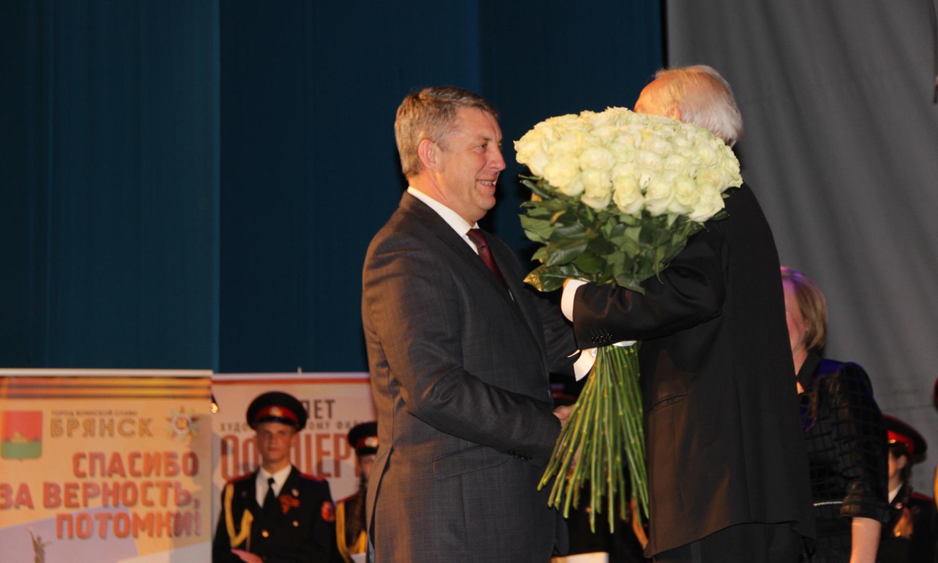 — Сегодня на нашей легендарной Брянской земле большой праздник! Сегодня с нами легенда советского кинематографа, народный артист СССР Василий Семенович Лановой. Я хочу сказать вам огромные слова благодарности за этот вечер, за эти минуты радости, за то, что все мы смогли прикоснуться к легенде, к вашему таланту! Фильму «Офицеры» — 45 лет, и, действительно, очень много моих друзей стали офицерами, в том числе и благодаря этому фильму. Они выбрали для себя настоящую мужскую профессию — защищать нашу Родину! Вчера мне позвонил наш военный комиссар, генерал-майор, который сказал, что не сможет присутствовать на одном из мероприятий, потому что приезжает его вышестоящий начальник — генерал-полковник. На это я спросил, кто и почему я не в курсе? А он мне ответил: «Как кто? Василий Семенович Лановой!». Это говорит о том, как к вам относятся наши военные! Вы — наша национальная гордость! Мы всегда будем рады видеть Вас на нашей Брянской земле! Спасибо Вам и низкий поклон!