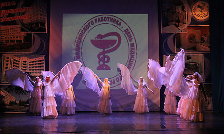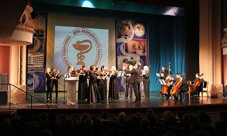 Студенты медицинского техникума вручили ветеранам здравоохранения, присутствующим в зрительном зале, цветы. Торжественное собрание, посвященное Дню медицинского работника, продолжилось праздничным концертом.