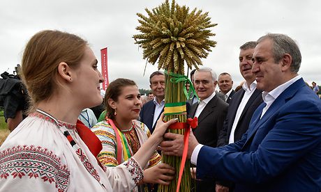 Секретарю Генерального совета Партии «Единая Россия», Заместителю Председателя Государственной Думы ФС РФ Сергею Неверову и Губернатору Брянской области Александру Богомазу торжественно вручили традиционный первый сноп урожая 2017 года.