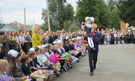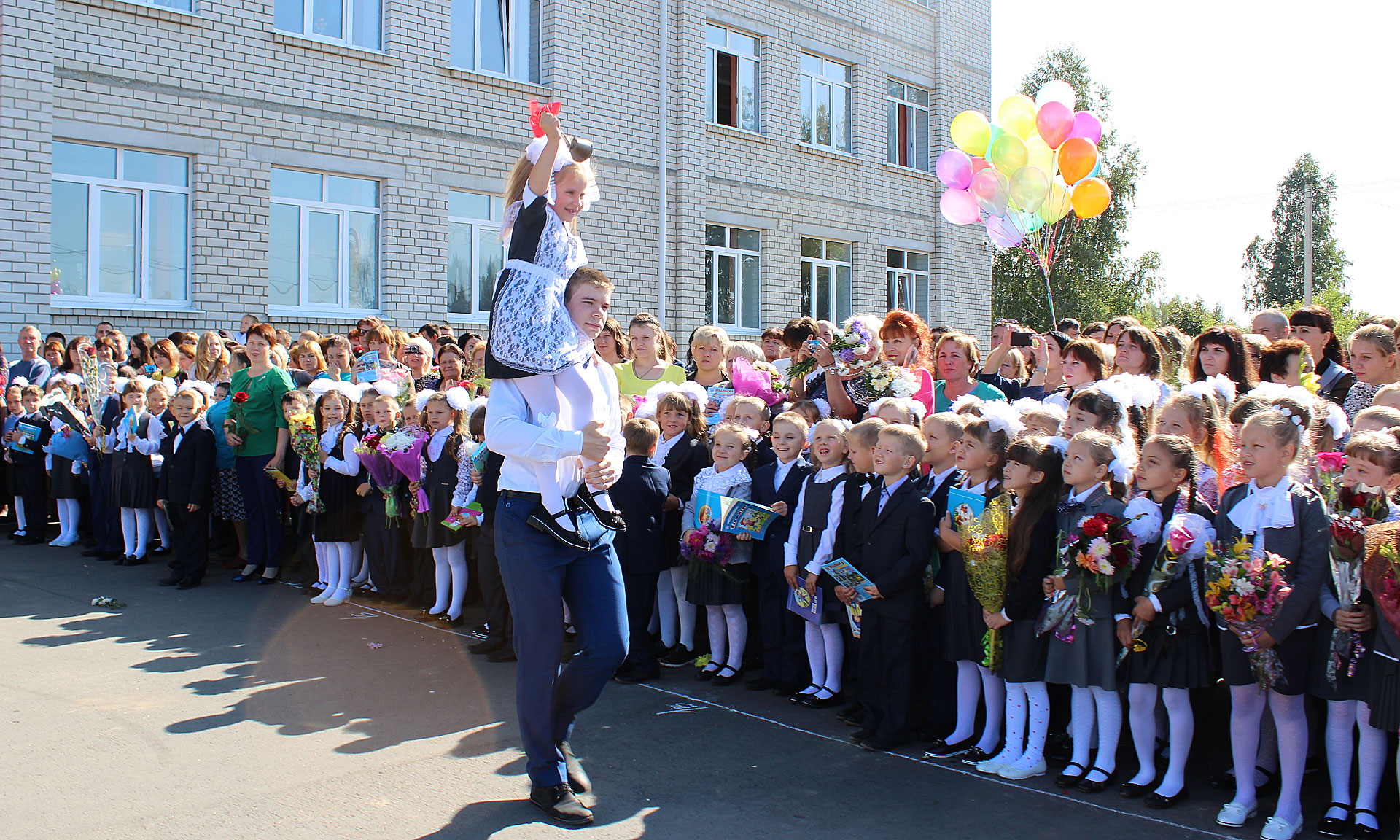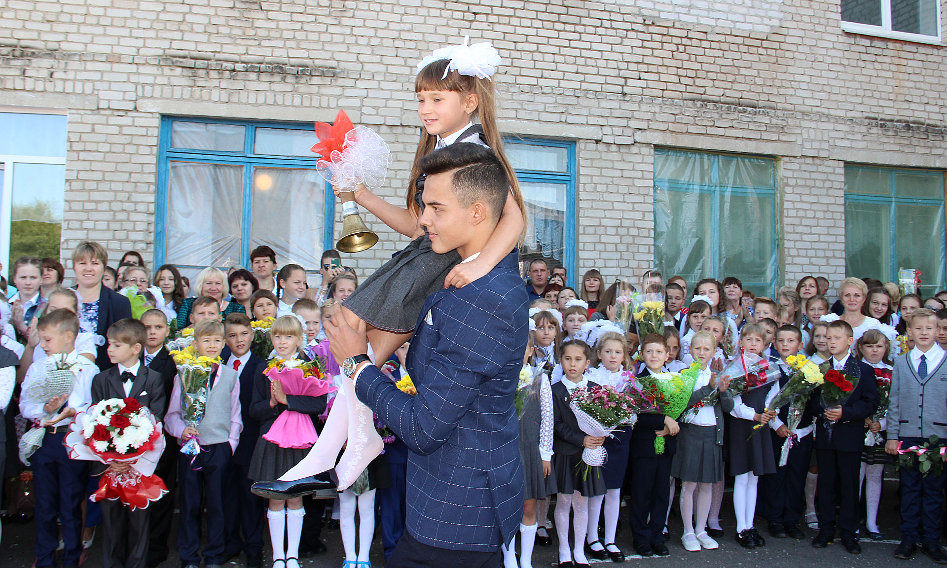 Прозвучал первый звонок, который подала колокольчиком первоклассница, сидя на сильном плече одиннадцатиклассника.