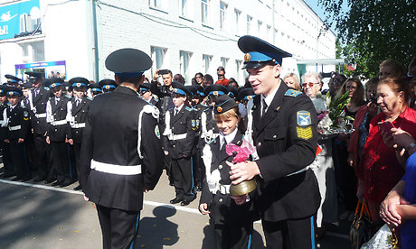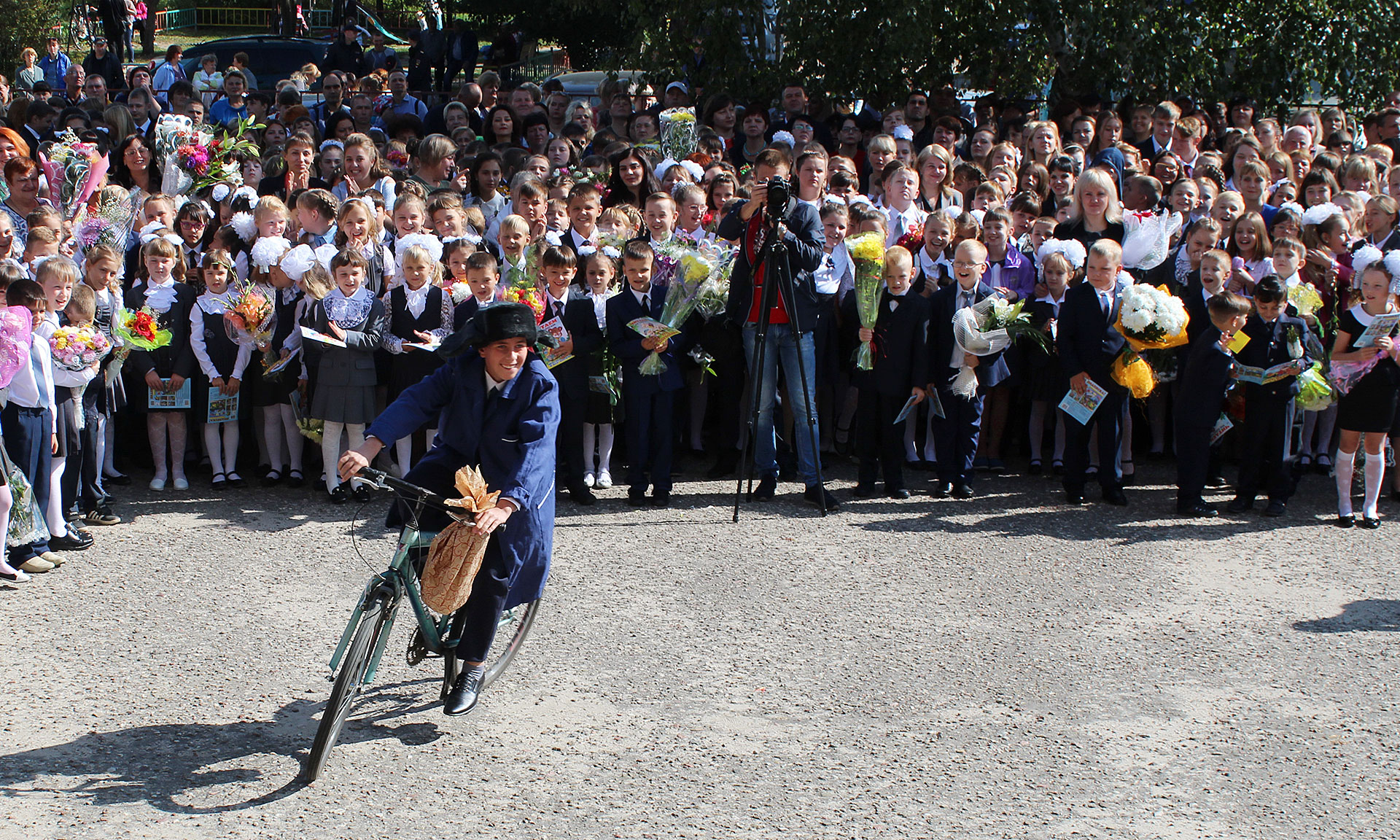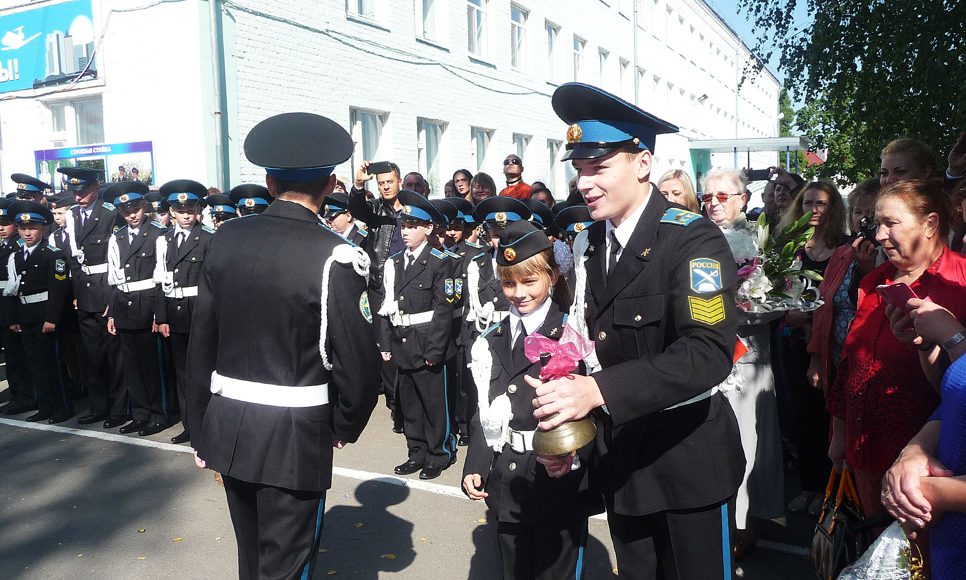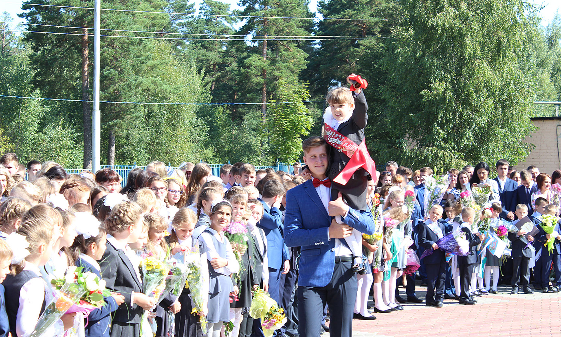 Прозвучал первый звонок, который подала колокольчиком первоклассница, сидя на сильном плече одиннадцатиклассника.