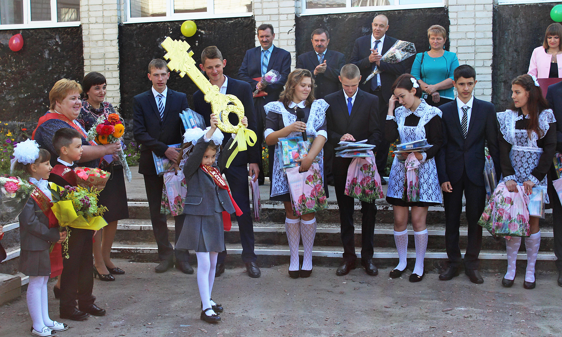 Александр Пущиенко вручил первоклассникам подарки — книги. Королева школьных наук пожелала мальчишкам и девчонкам терпения и трудоспособности. Первоклассникам она передала символический Ключ знаний. В знак благодарности ребята прочитали веселые стихотворения и исполнили песню.