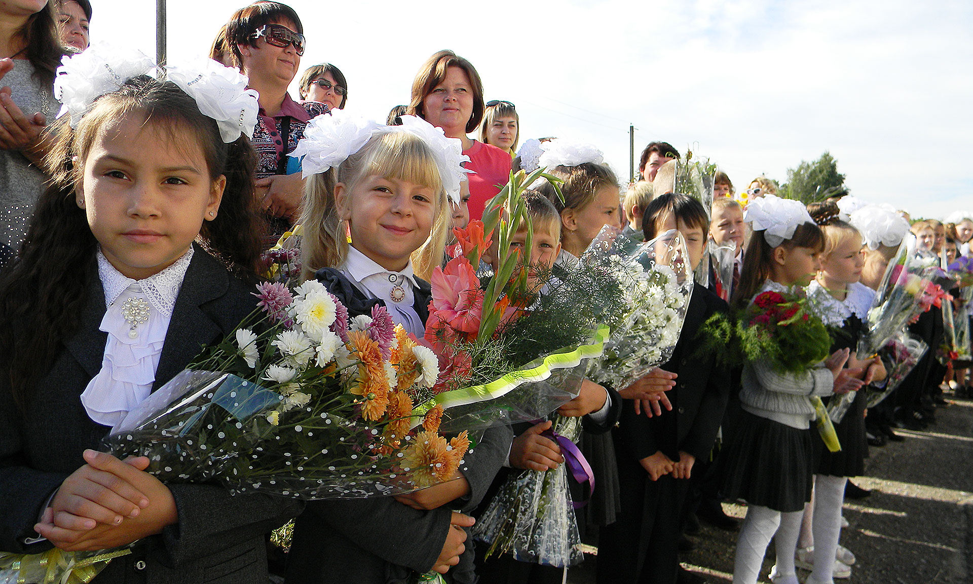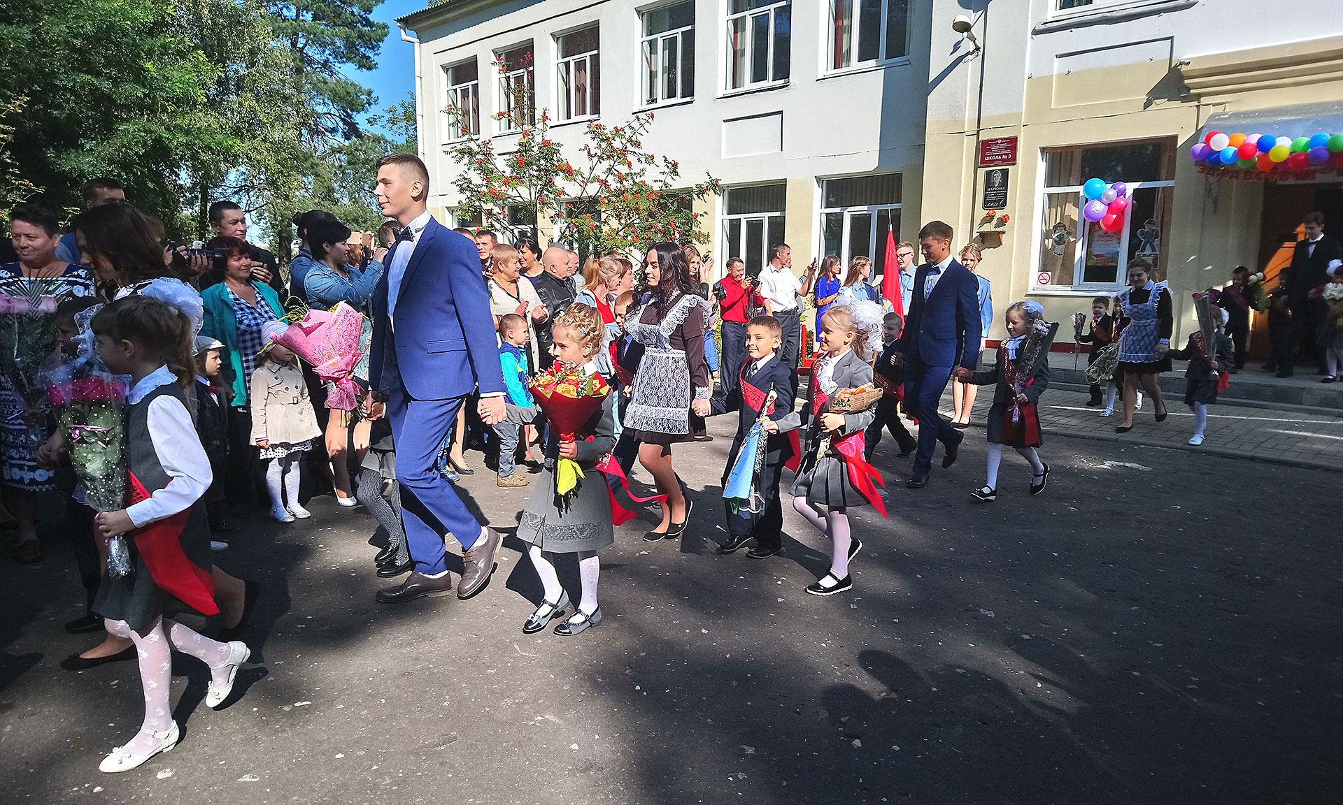 Вместе со всеми, казалось, в этот день ликовали и небеса — в синеве не было ни единого облачка, только — пригревающее сентябрьское солнце. А сколько букетов в этот день было подарено любимым учителям!