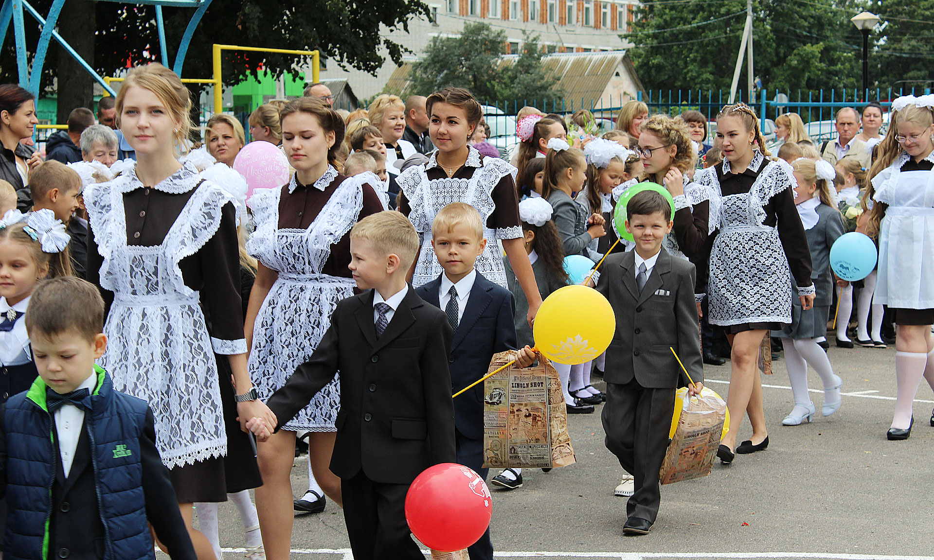 И по традиции ученики выпускных классов повели первоклашек на первый в их жизни урок.