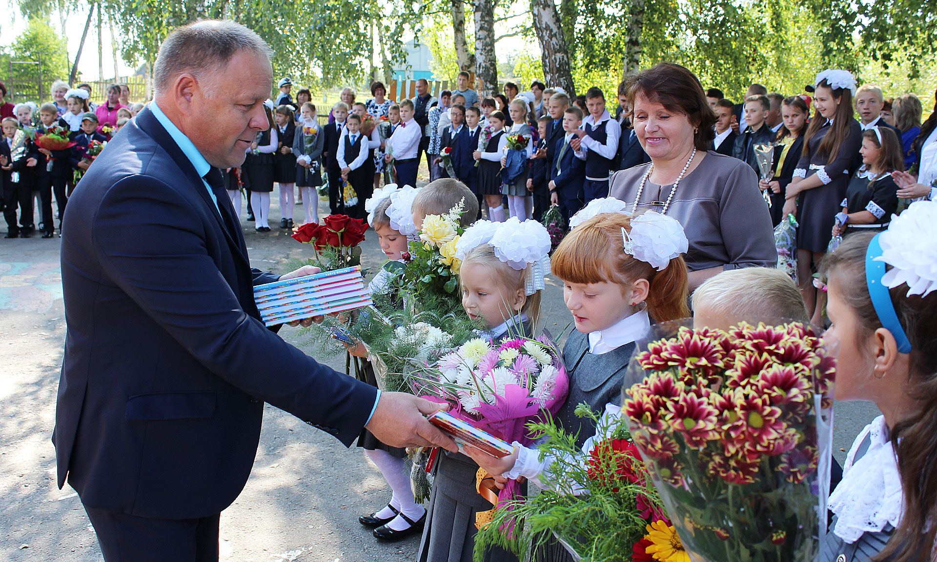 Учащихся Красносельской средней школы имени Героя Советского Союза М. Д. Цыкина поздравляли с началом нового учебного года генеральный директор АО «Брянскавтодор» Владимир Миллер и заместитель директора УКС Брянской области Роман Сенокос.