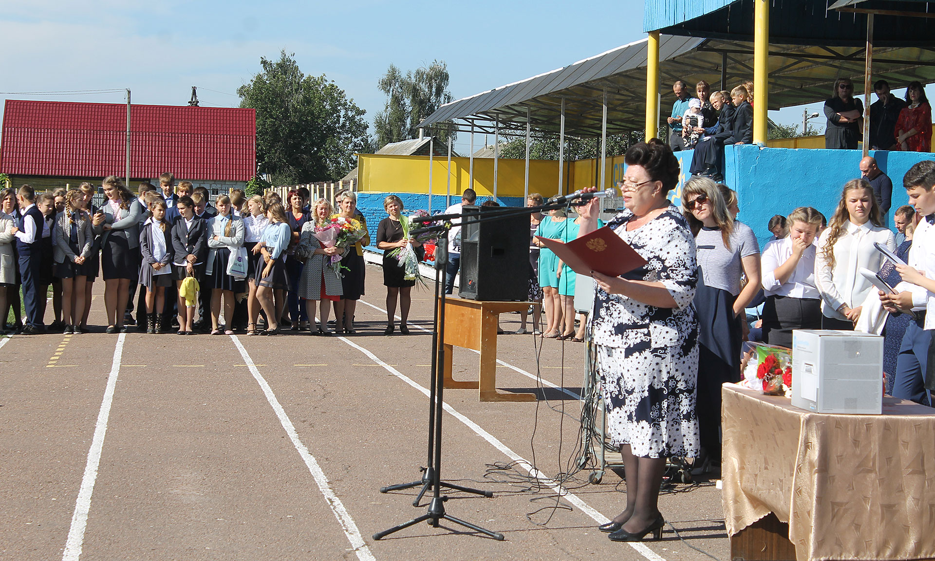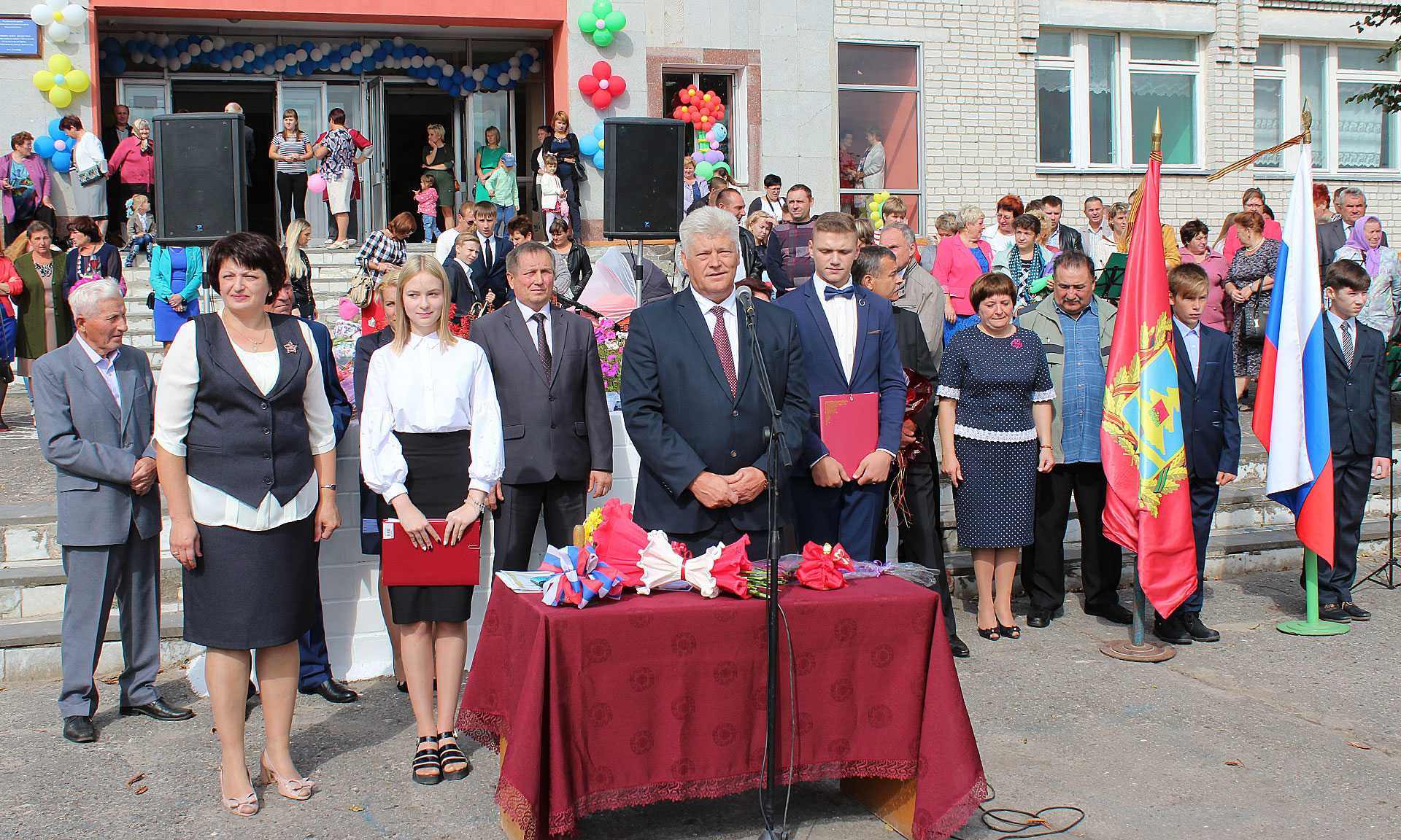 Первым своих учеников, коллег, родителей, гостей с началом учебного года поздравил директор школы Владимир Прокопцев. На линейке присутствовали почетные гости. Заместитель Губернатора Брянской области Галина Петушкова передала теплые слова поздравлений и пожеланий учителям, ребятам, родителям от Губернатора области Александра Богомаза.