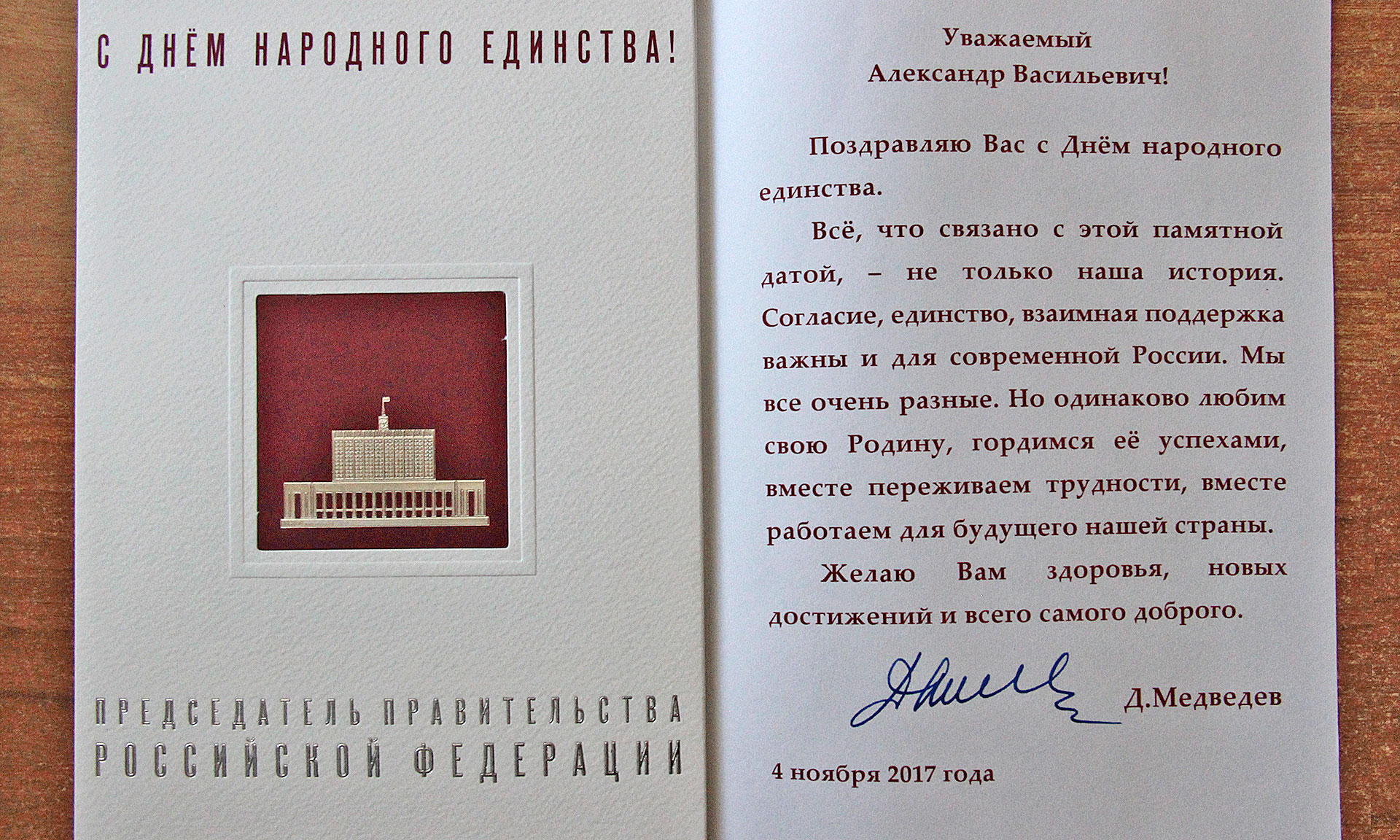 В адрес Губернатора Брянской области Александра Богомаза поступило поздравление с Днем народного единства от Председателя Правительства РФ Дмитрия Медведева.