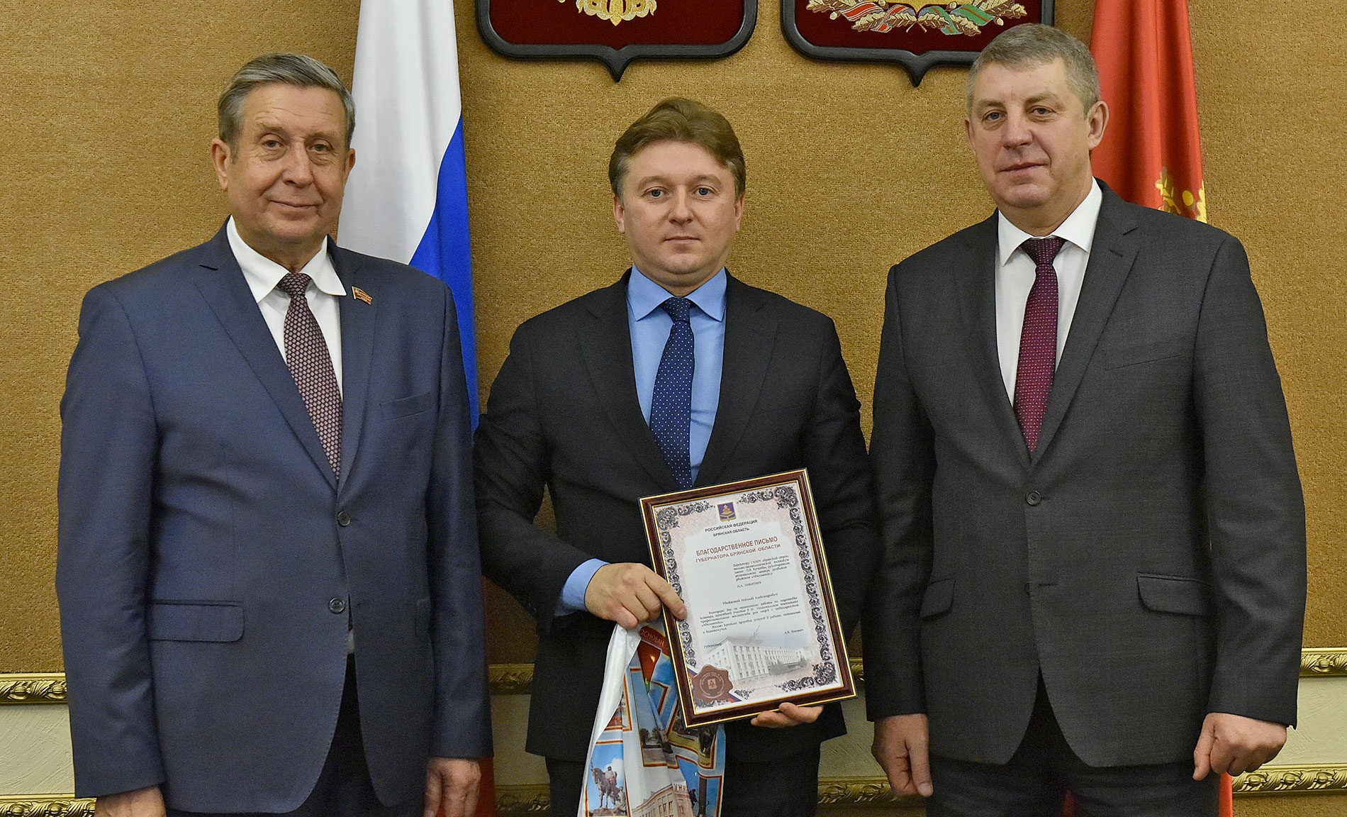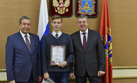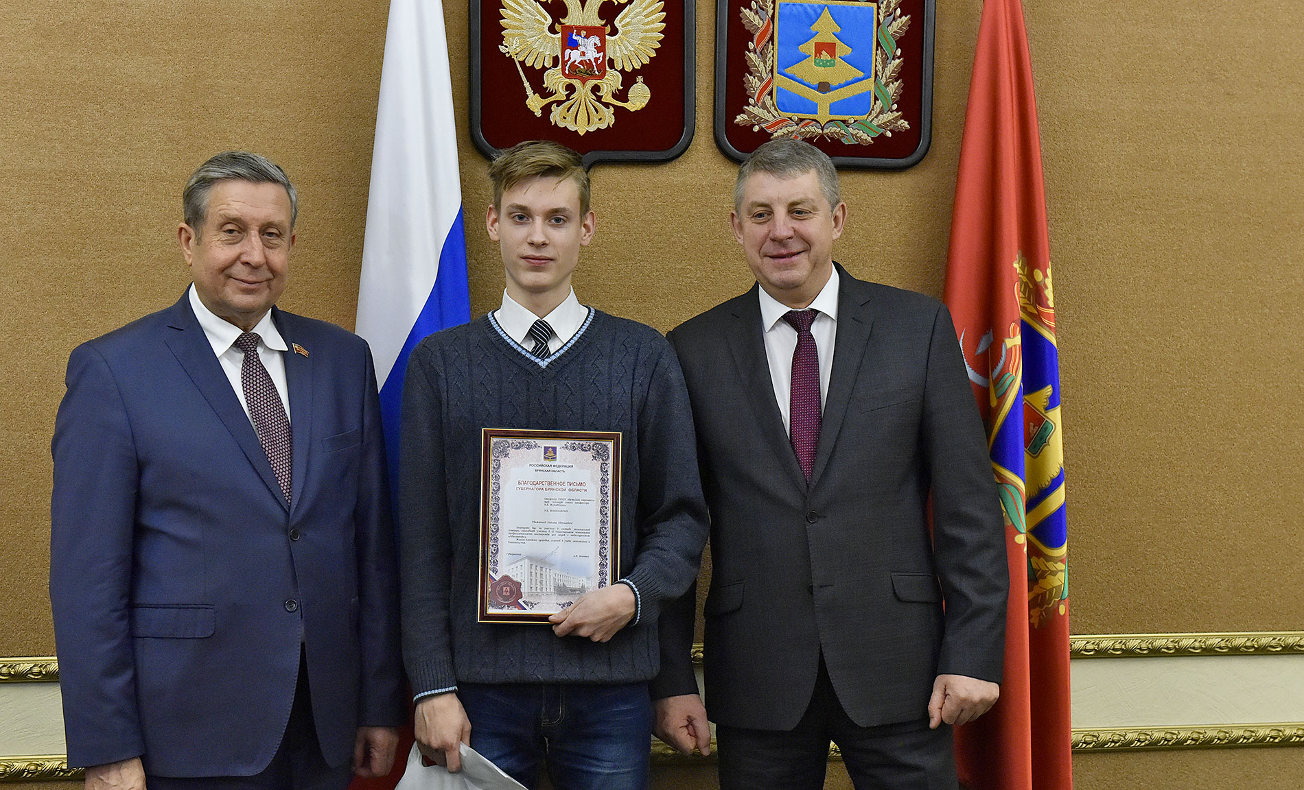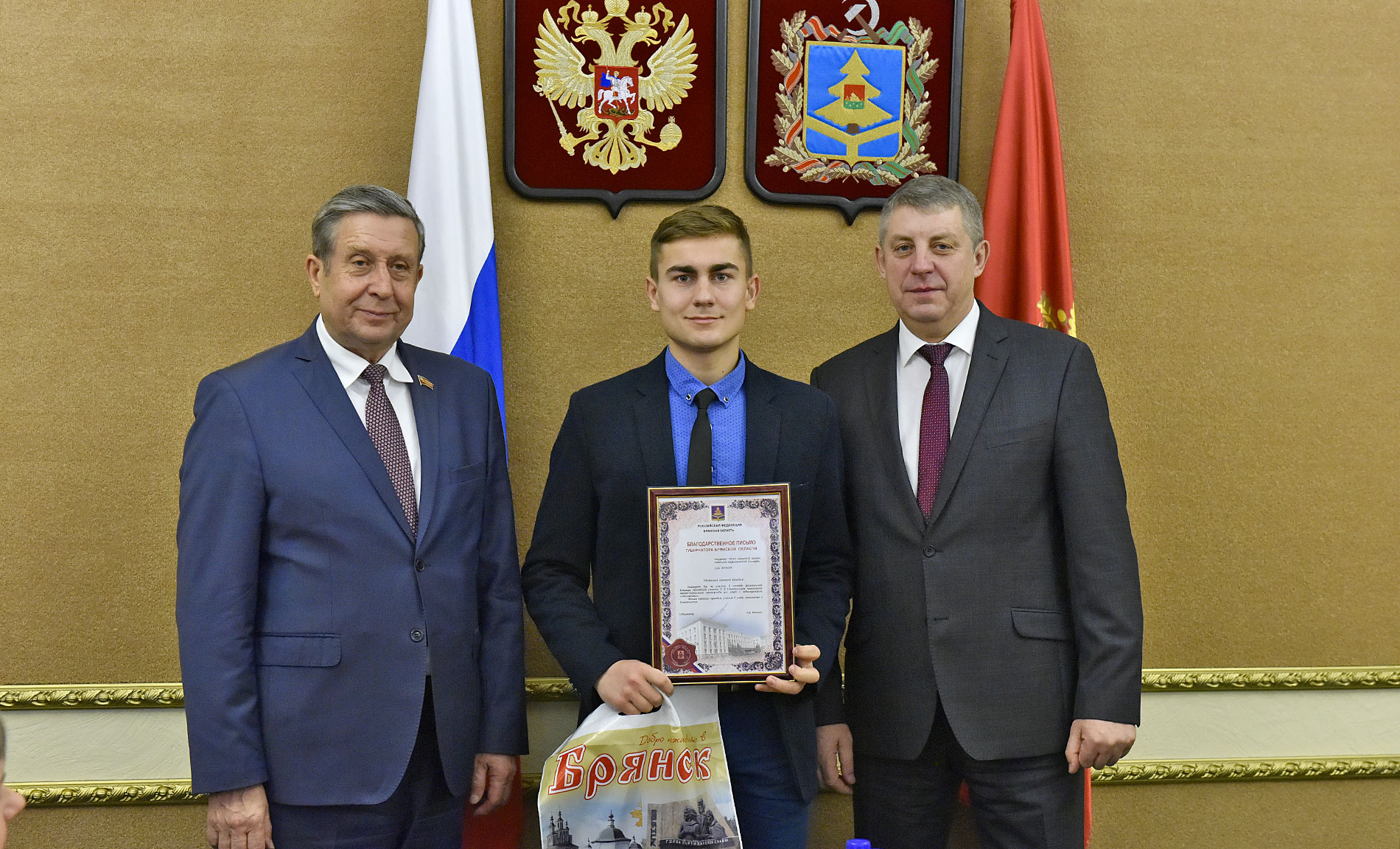 Губернатор Брянской области вручил членам региональной команды, принявшей участие III национальном чемпионате профессионального мастерства для людей с инвалидностью «Абилимпикс», Благодарственные письма и подарки — их получили и студенты, и педагоги. По окончании церемонии Виктор Странадко и Екатерина Рак подарили Александру Богомазу вымпел «Абилимпикса».