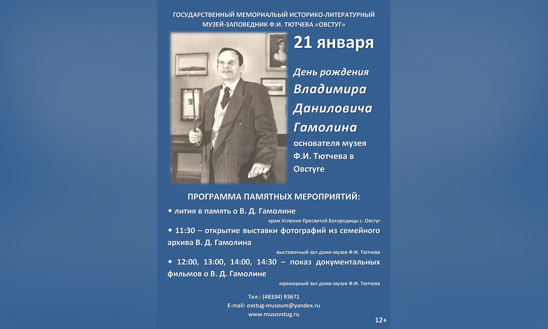 21 января 2018 года музей-заповедник Ф. И. Тютчева «Овстуг» проводит мероприятия, посвященные дню рождения основателя Тютчевского музея в Овстуге Владимира Даниловича Гамолина, почетного гражданина Брянской области, заслуженного учителя РСФСР.