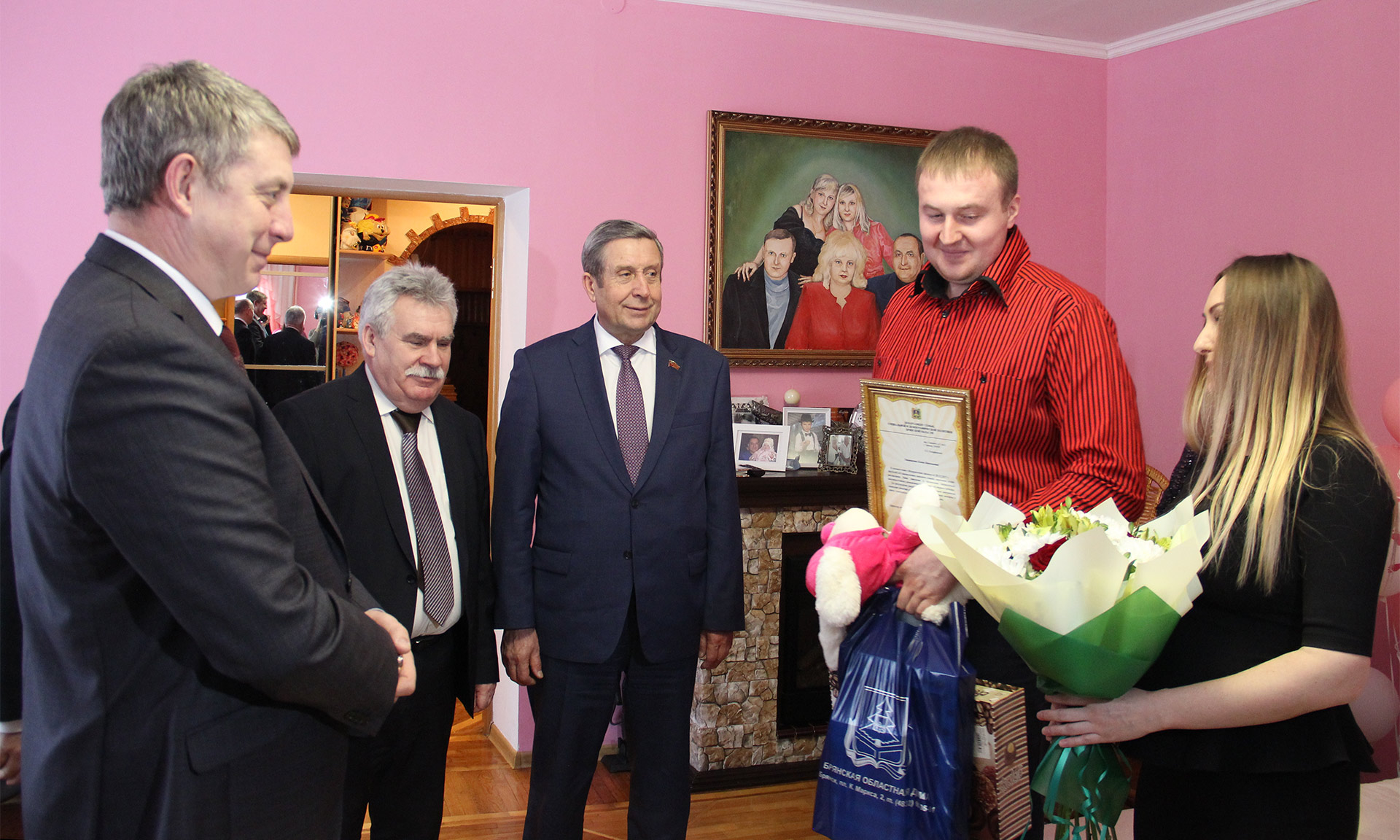Приятным сюрпризом для молодых родителей стал приезд первых лиц области. Губернатор Александр Богомаз пожелал молодой семье счастья и здоровья, а также не останавливаться на достигнутом: