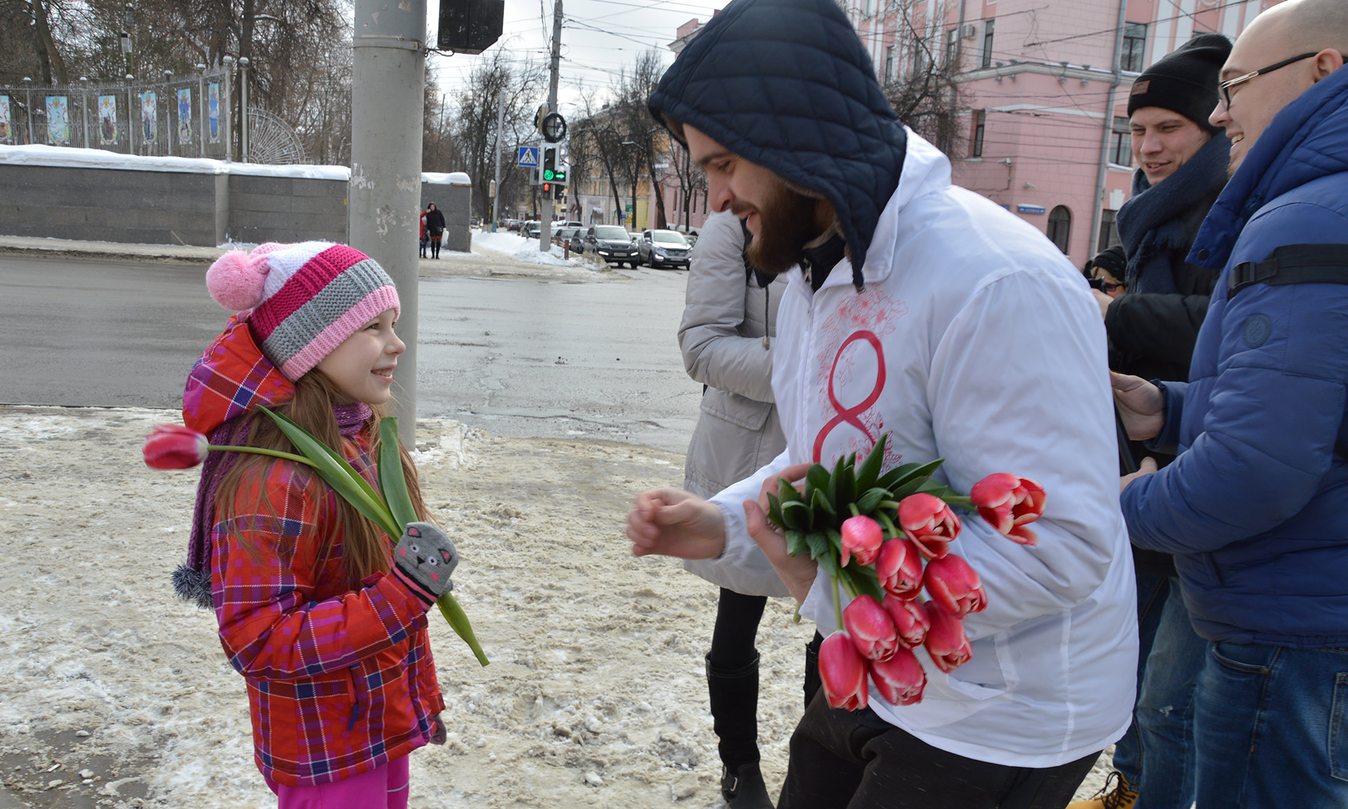 Сегодня волонтеры высших учебных заведений Брянской области дарили цветы всем женщинам, которые оказались на Театральной площади и ехали в автомобилях. Волонтеры поздравляли девочек, девушек, женщин, пели песни и желали больше улыбок и солнечных дней.