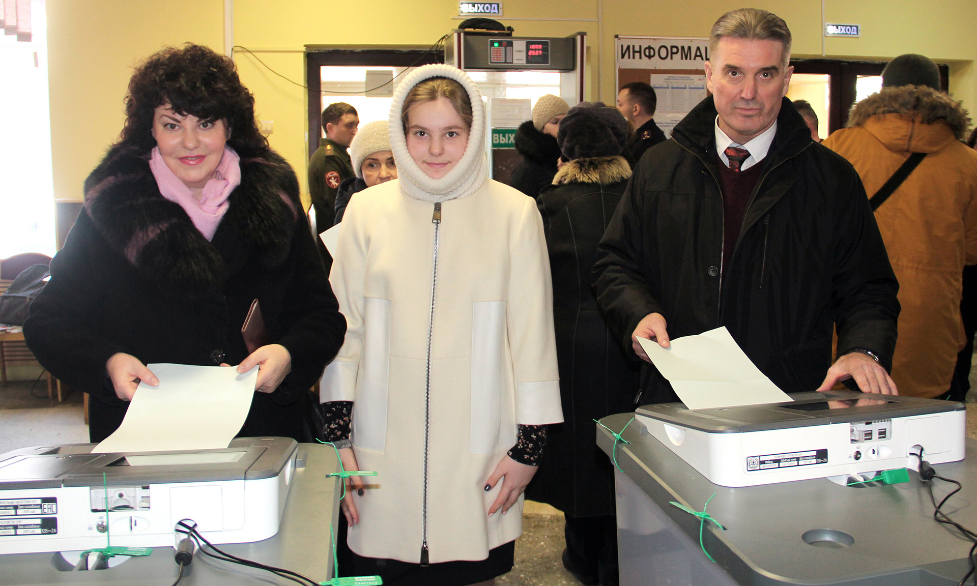 Начальник УМВД России по Брянской области Валентин Кузьмин принял участие в голосовании на выборах президента РФ. Вместе с ним на избирательный участок № 94 пришли его супруга и дочь.