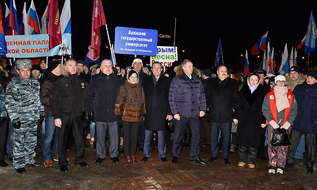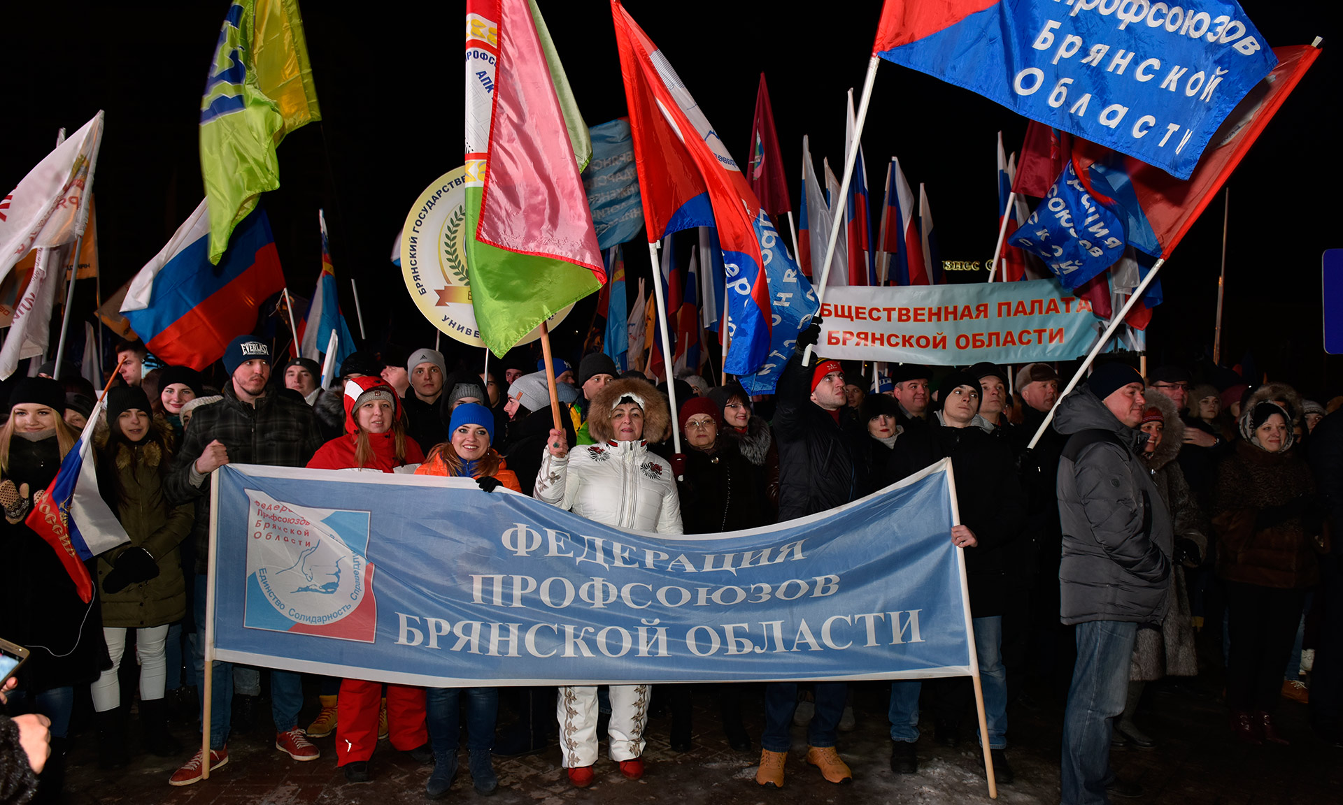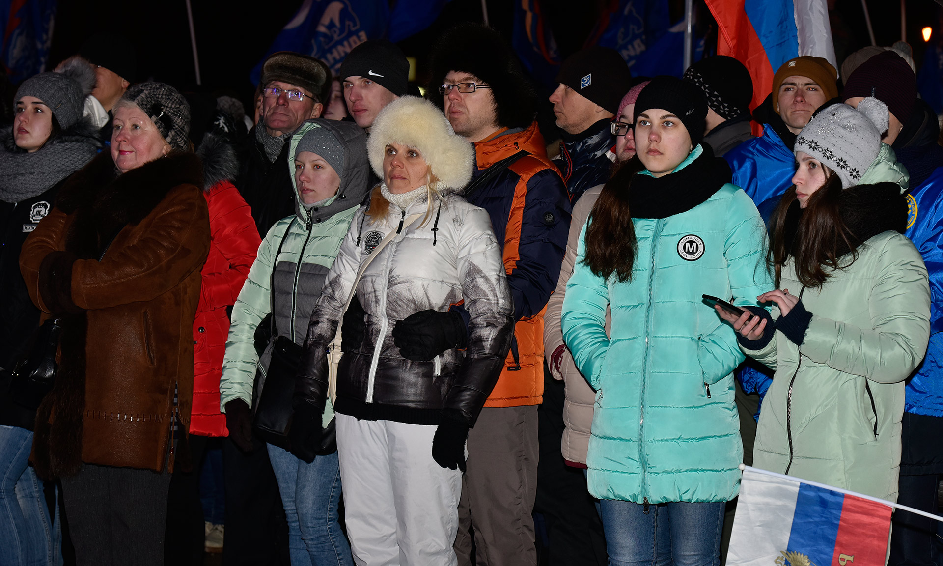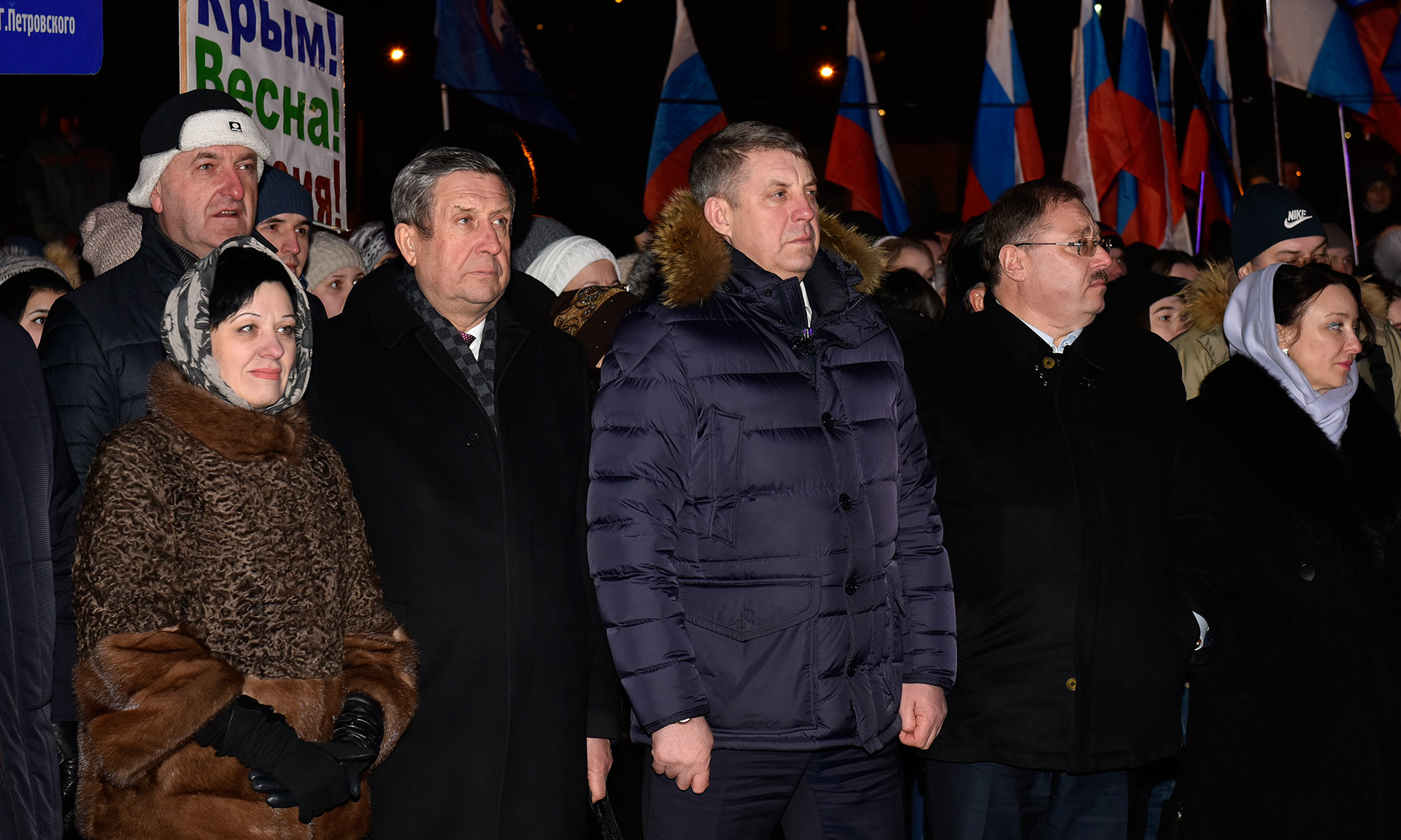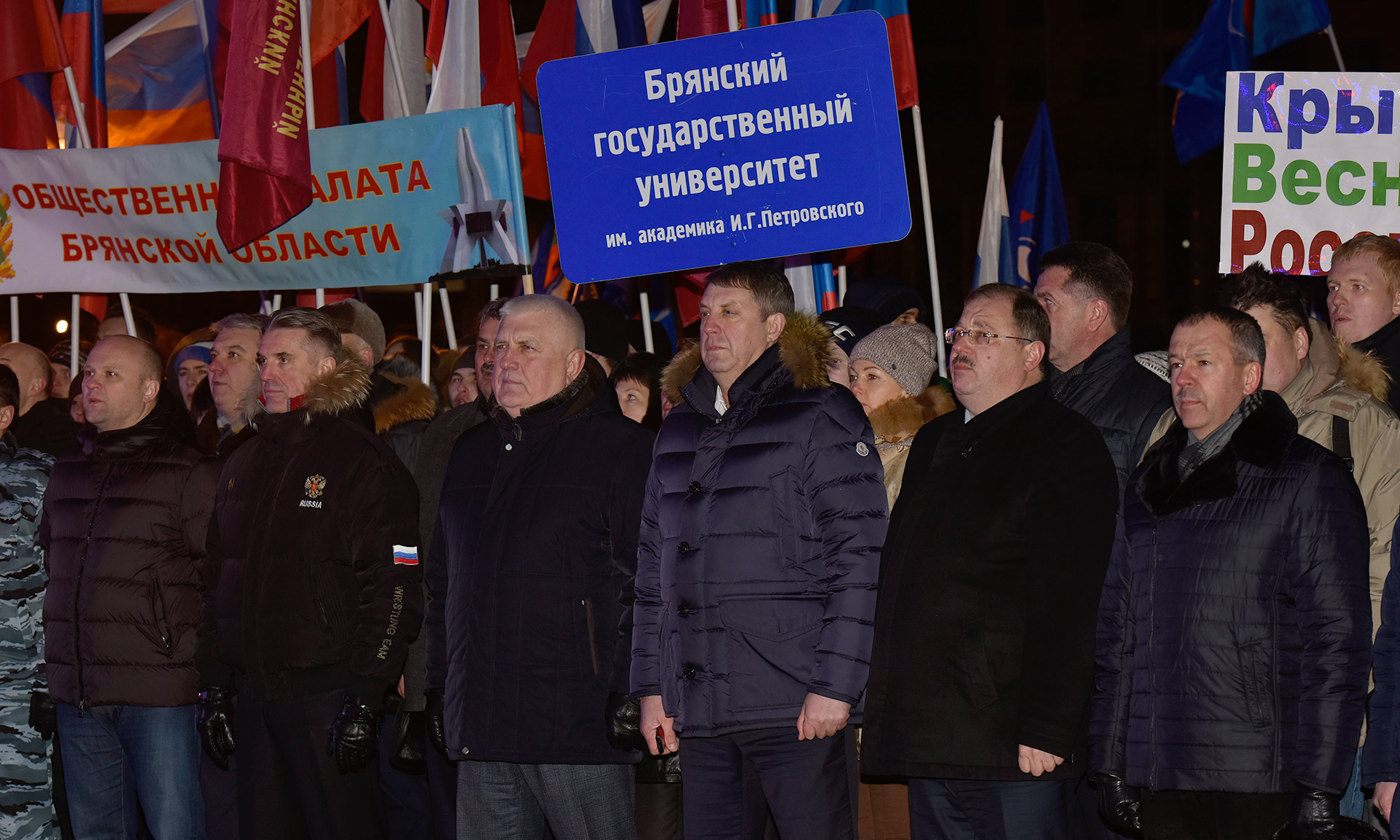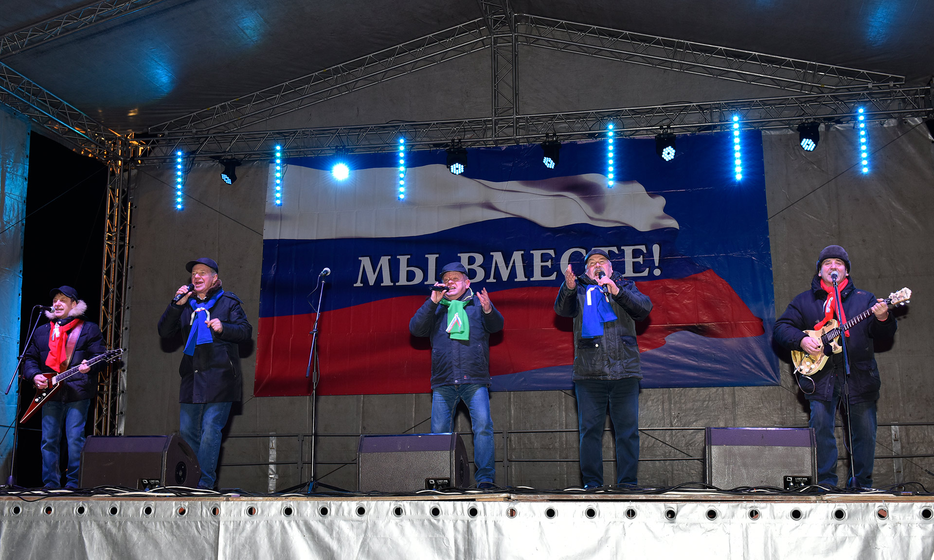 Ансамбль народной музыки «Ватага» исполнил песню «Россию строят мужики», которой подпевала вся площадь. Брянщина сделала свой выбор, и это курс на стабильность и устойчивое развитие страны. Рабочие Бежицы, представители предприятий и организаций Фокинского района, Володарский и Советский районы Брянска — тысячи людей собрались этим вечером на площади Воинской Славы, чтобы подтвердить, что им не нужны потрясения и войны, им нужна спокойная мирная жизнь.