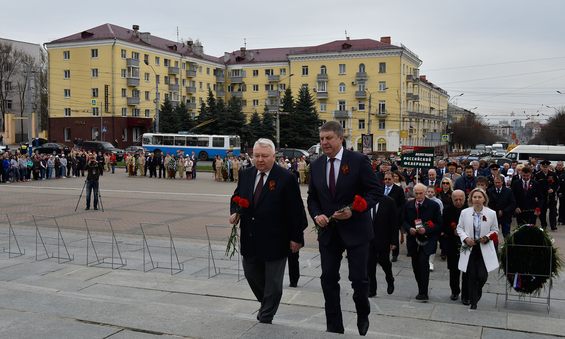Международный форум Победителей «Великая Победа, добытая единством: подвиг партизан и подпольщиков в Великой Отечественной войне», который проходит сегодня в Брянске, начался с церемонии возложения цветов на площади Партизан.