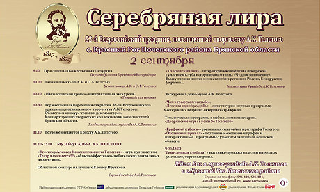 2 сентября в селе Красный Рог Почепского района Брянской области пройдет уже традиционный, любимый многими жителями Брянщины праздник, посвященный творчеству Алексея Константиновича Толстого — «Серебряная Лира».