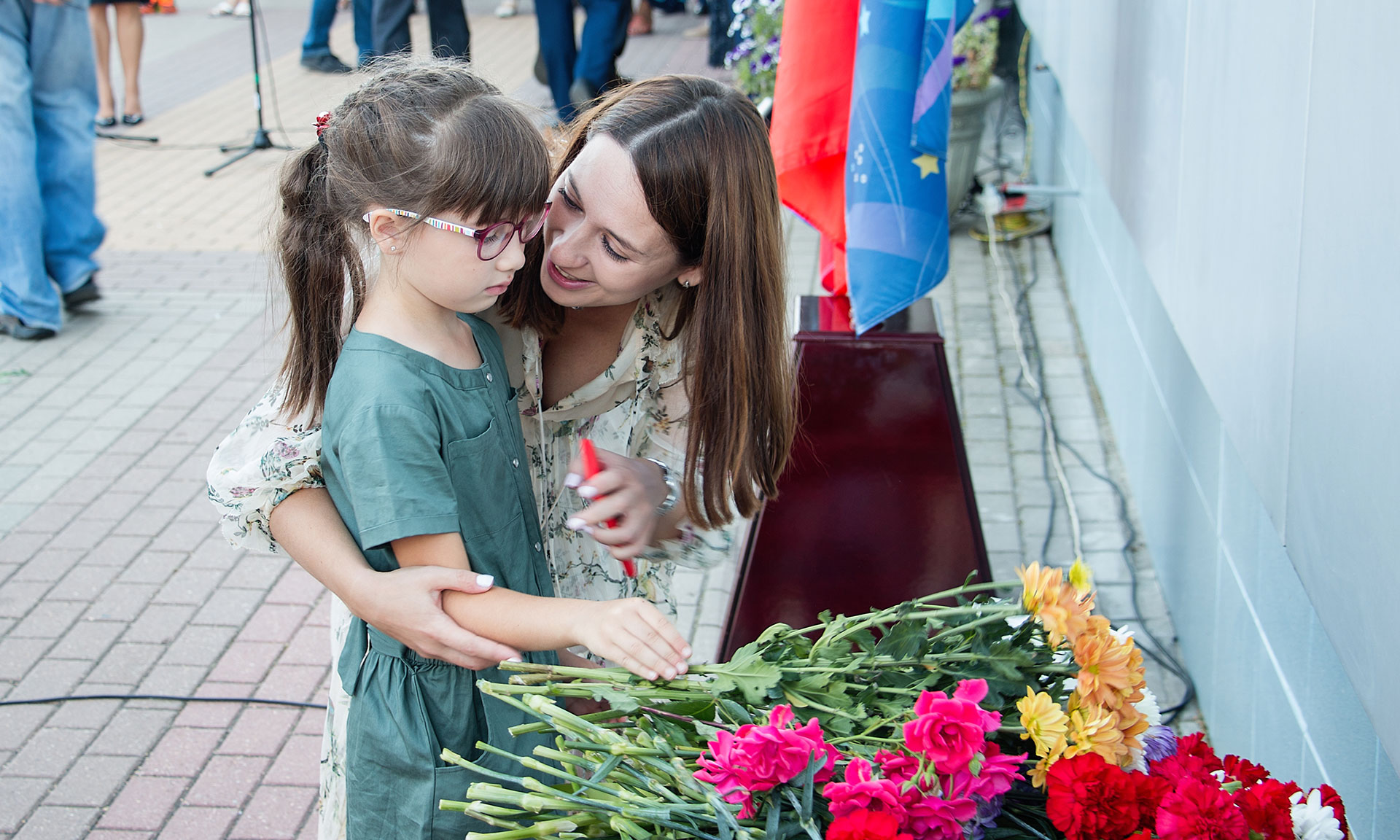 В митинге приняли участие родственники Маркушевича: сын и его семья. Цветы к мемориальной доске возложили внучка и правнучка Семена Борисовича.