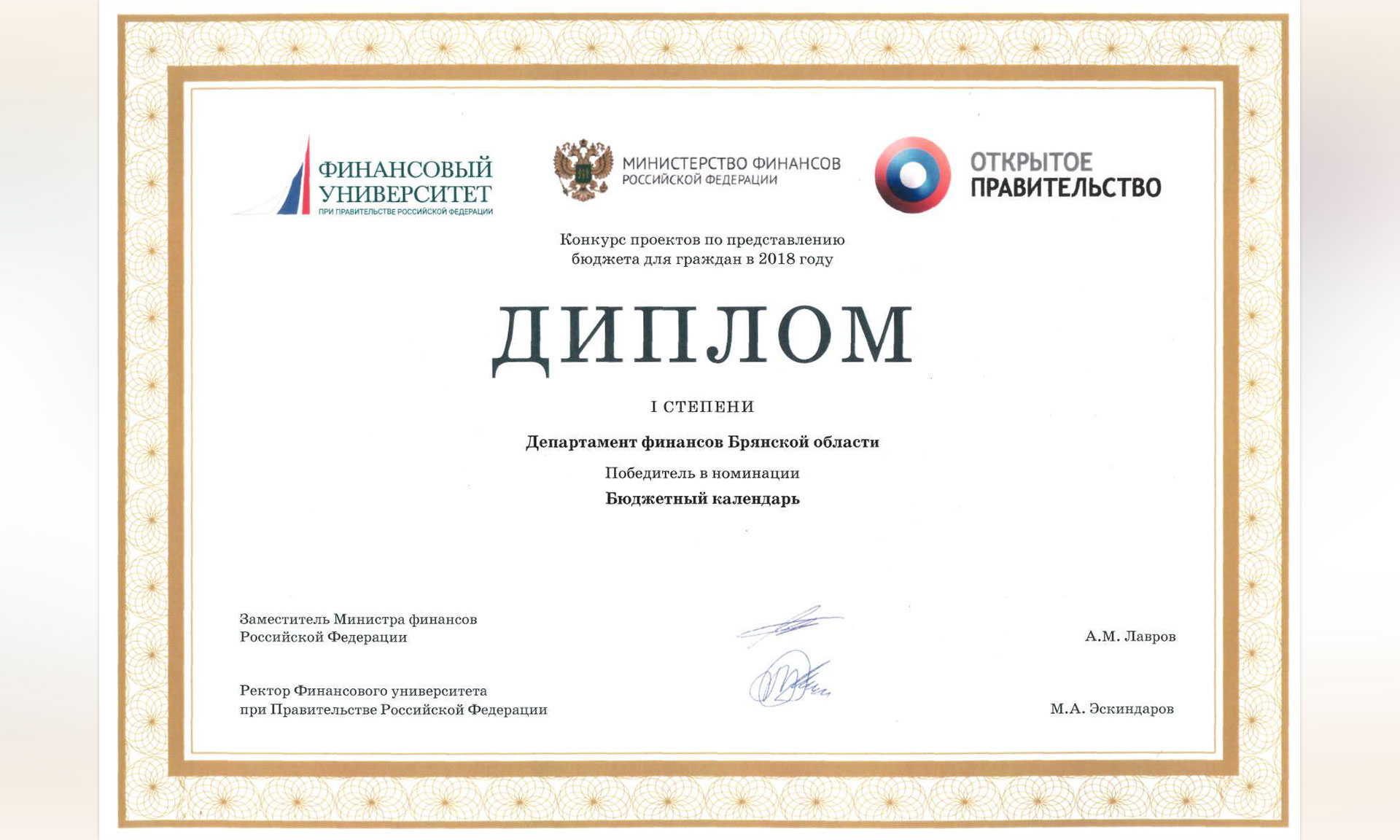 В номинации «Бюджетный календарь» за создание эффективного инструмента, направленного на обеспечение контроля сроков выполнения основных этапов бюджетного цикла, диплом первой степени получил Департамент финансов Брянской области, который ежегодно является участником данного конкурса.