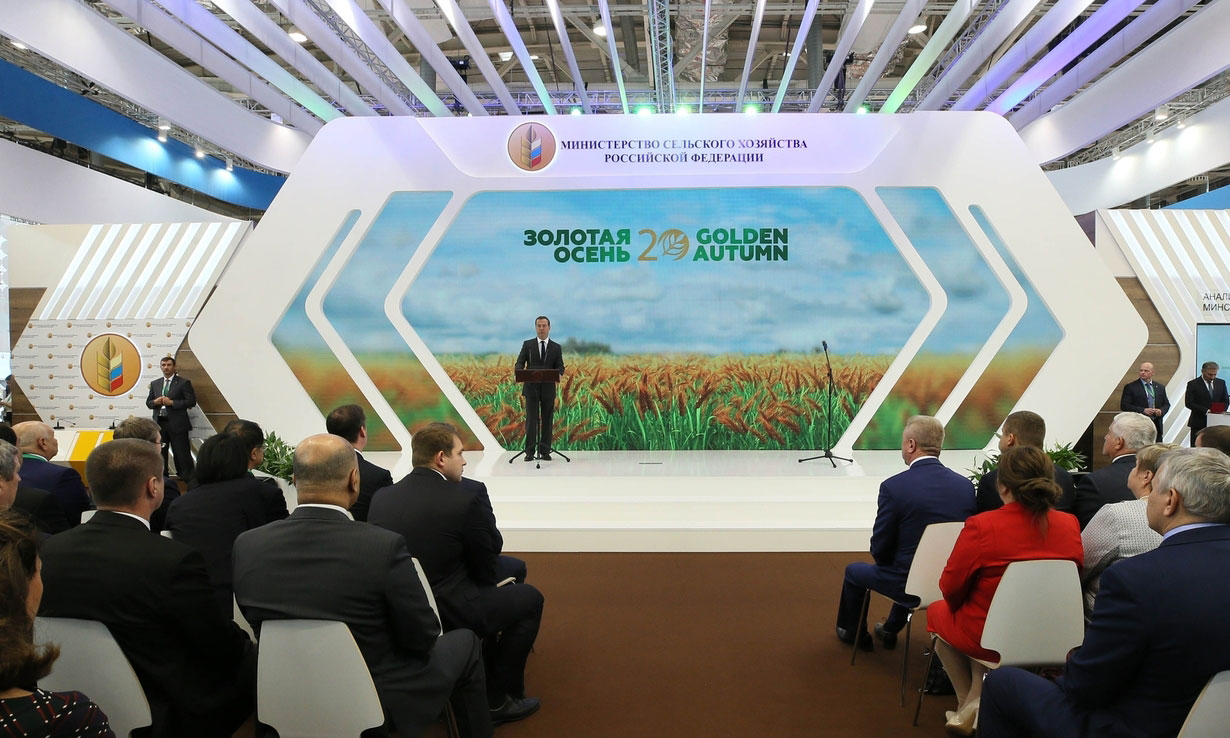 С 10 по 13 октября в Москве на территории ВДНХ проходит 20-я Российская агропромышленная выставка «Золотая осень». В мероприятии принимает участие Председатель Правительства Российской Федерации Дмитрий Медведев.