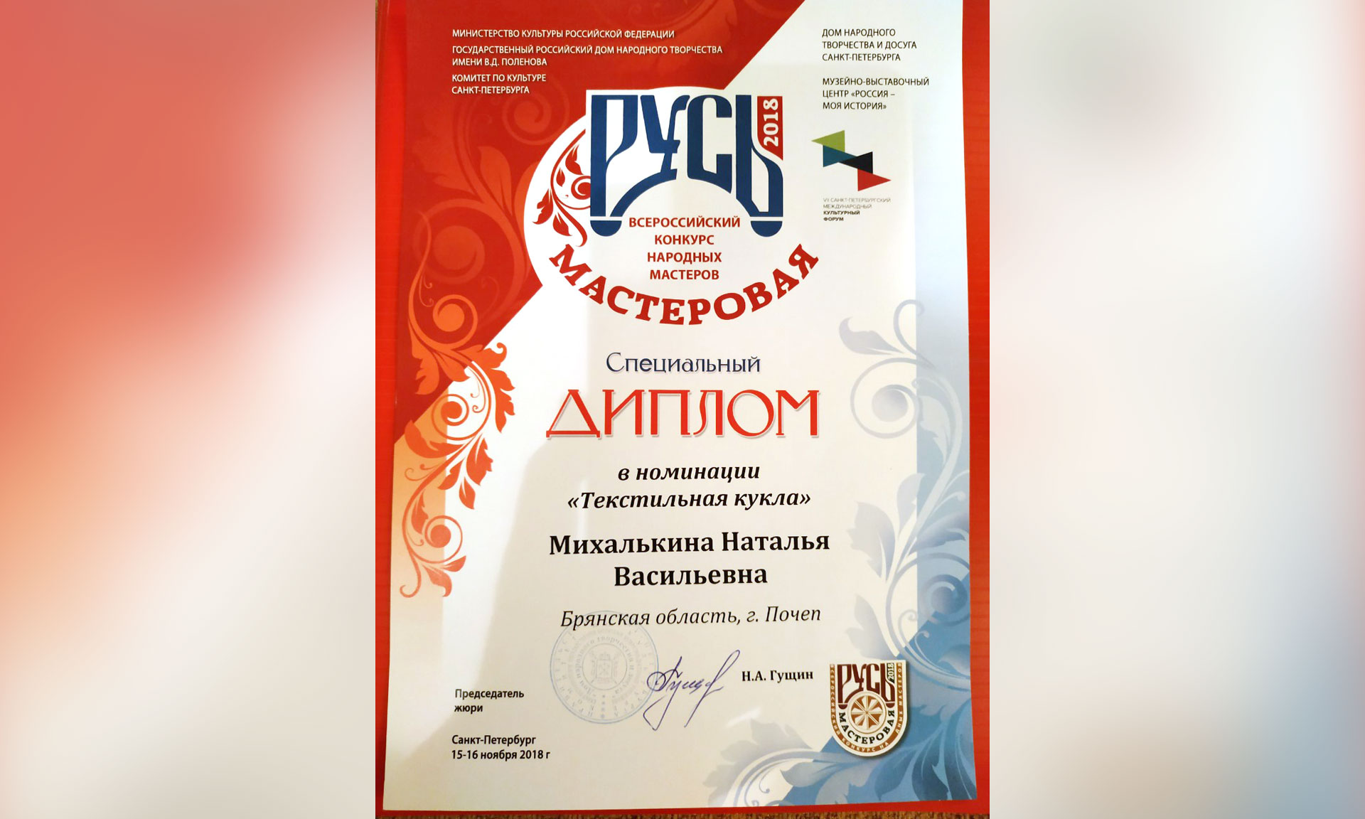 В рамках работы VII Санкт-Петербургского международного культурного форума состоялся ряд конкурсных программ. Конкурс «Русь мастеровая» проводился в форме открытого соревнования мастеров. Во время конкурса был организован пресс-показ, фото-сессия мастеров, для зрителей проводились многочисленные презентации, мастер-классы, выставка-ярмарка. Брянские мастера Наталья Михалькина и Александр Мысливченко представили на суд жюри свои работы. По результатам конкурса работы Натальи Михалькиной получили специальный диплом в номинации «Текстильная кукла».