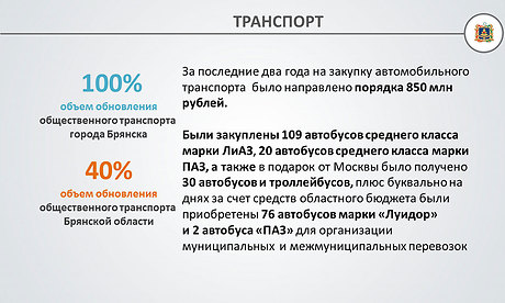 «По хорошим дорогам должен курсировать хороший транспорт», — такую задачу ставит Губернатор Брянской области Александр Богомаз. Как он отметил в отчете о работе Правительства за 2018 год, за последние два года на закупку автомобильного транспорта было направлено более 850 млн рублей.