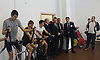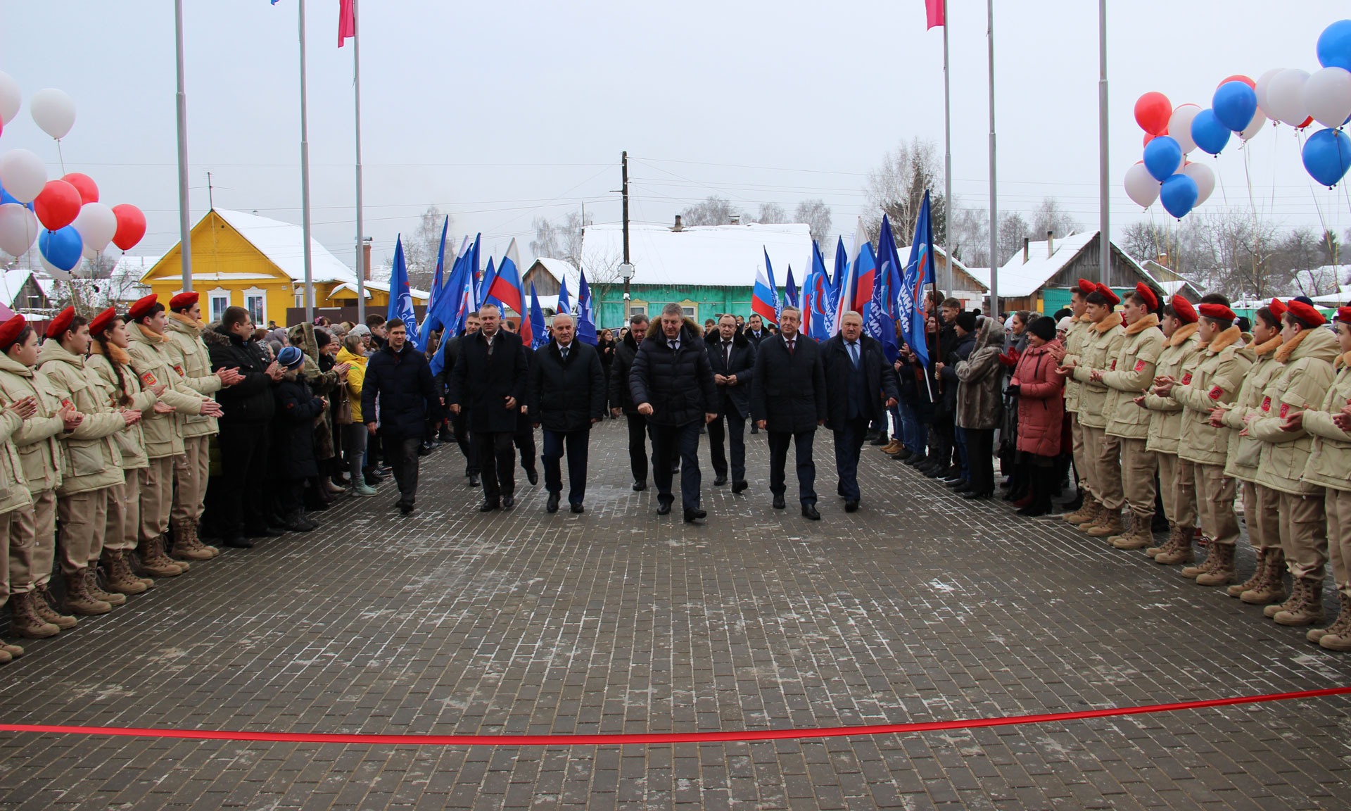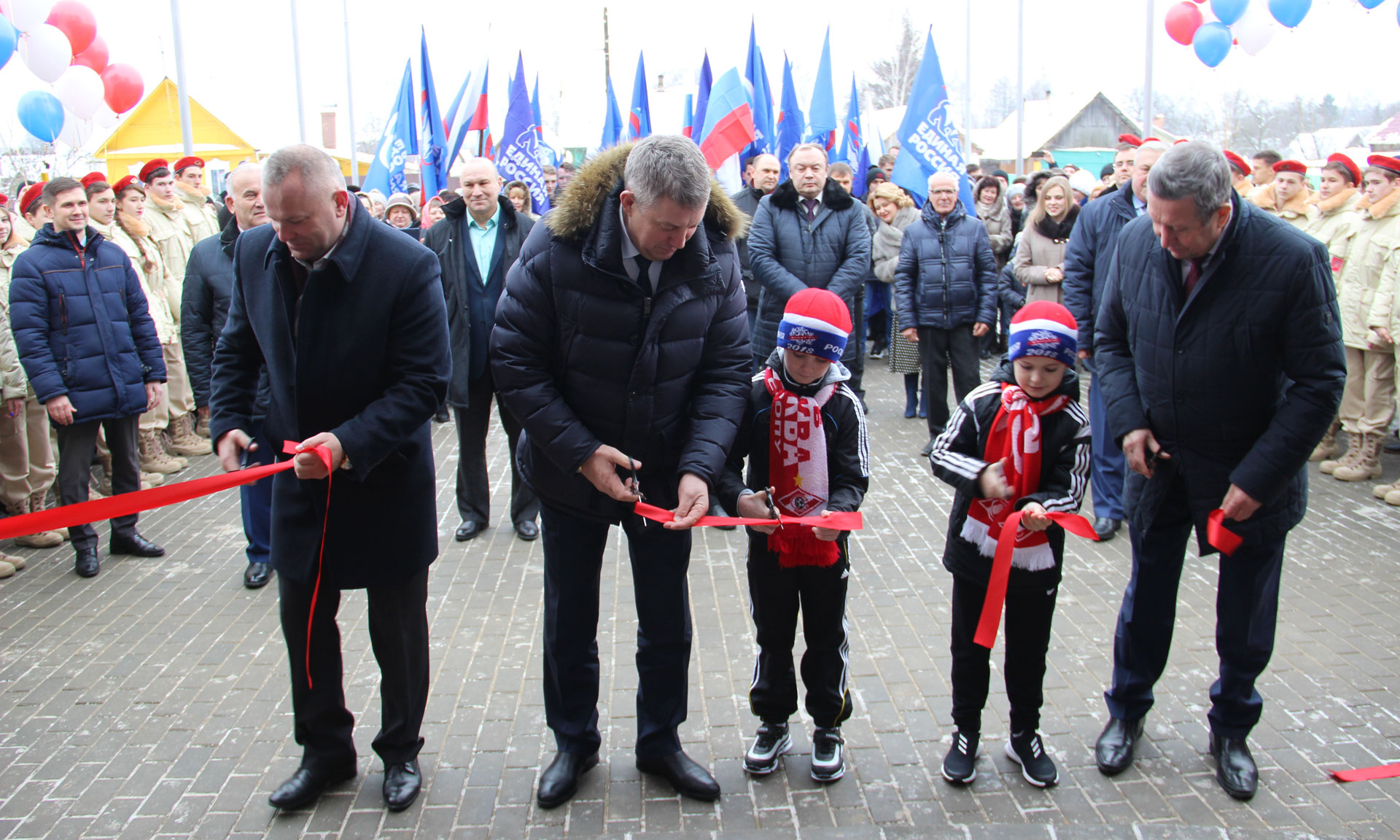 Почетных гостей на дорожке, ведущей к ФОКу, приветствовали воспитанники спортивных школ, члены «Юнармии», учащиеся, жители города. Право перерезать красную ленточку было предоставлено Александру Богомазу, Владимиру Попкову, Валентину Субботу и юным суражским спортсменам Тихону Тищенко и Артему Капылову.