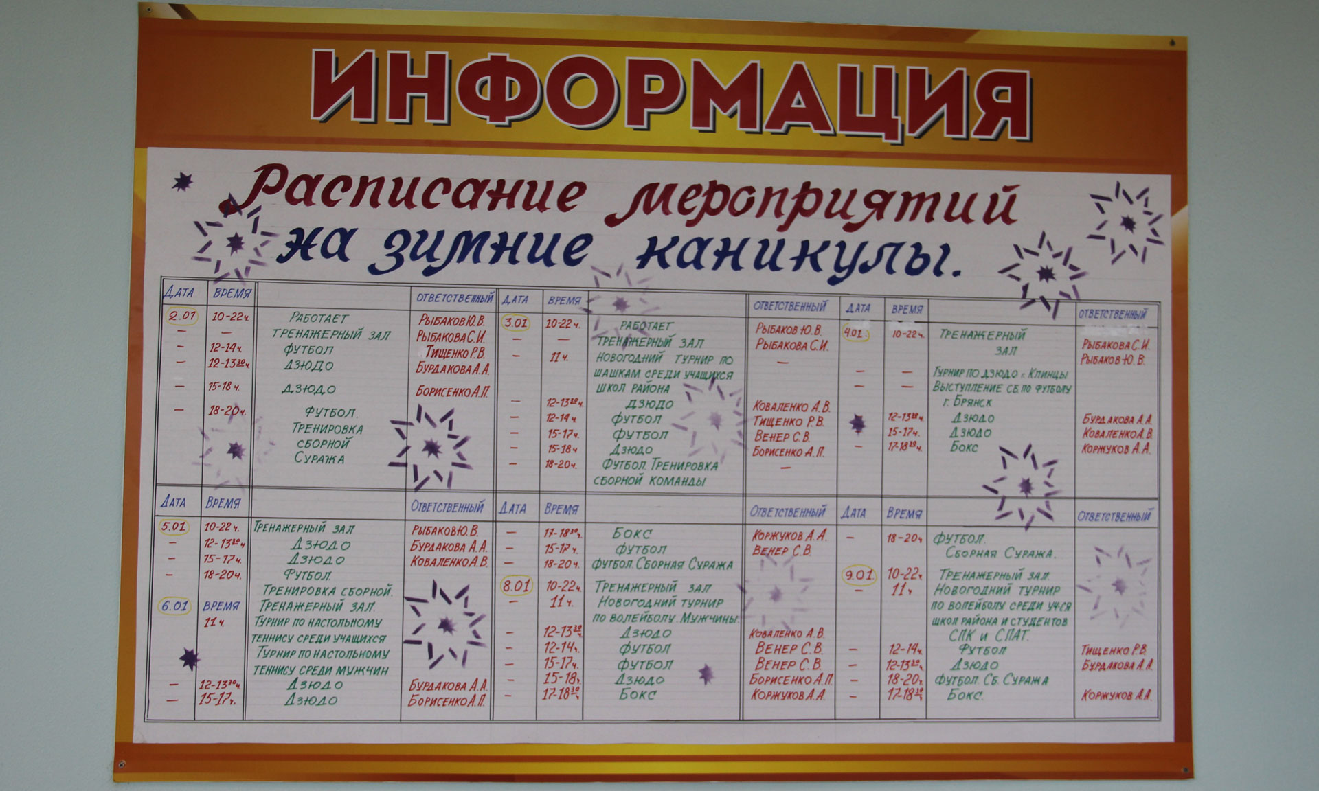 Строительство физкультурно-оздоровительного комплекса в Сураже началось в 2011 году, но из-за недостатка финансирования было прекращено. Завершение строительство этого объекта стало возможным благодаря четкой позиции Губернатора Александра Богомаза. В 2016 году выполнена корректировка проекта. В 2018 году на завершение строительства объекта был выделен 71 млн рублей (федеральный бюджет — 25 млн рублей, областной бюджет — 42 млн рублей, местный бюджет — 3,5 млн рублей).