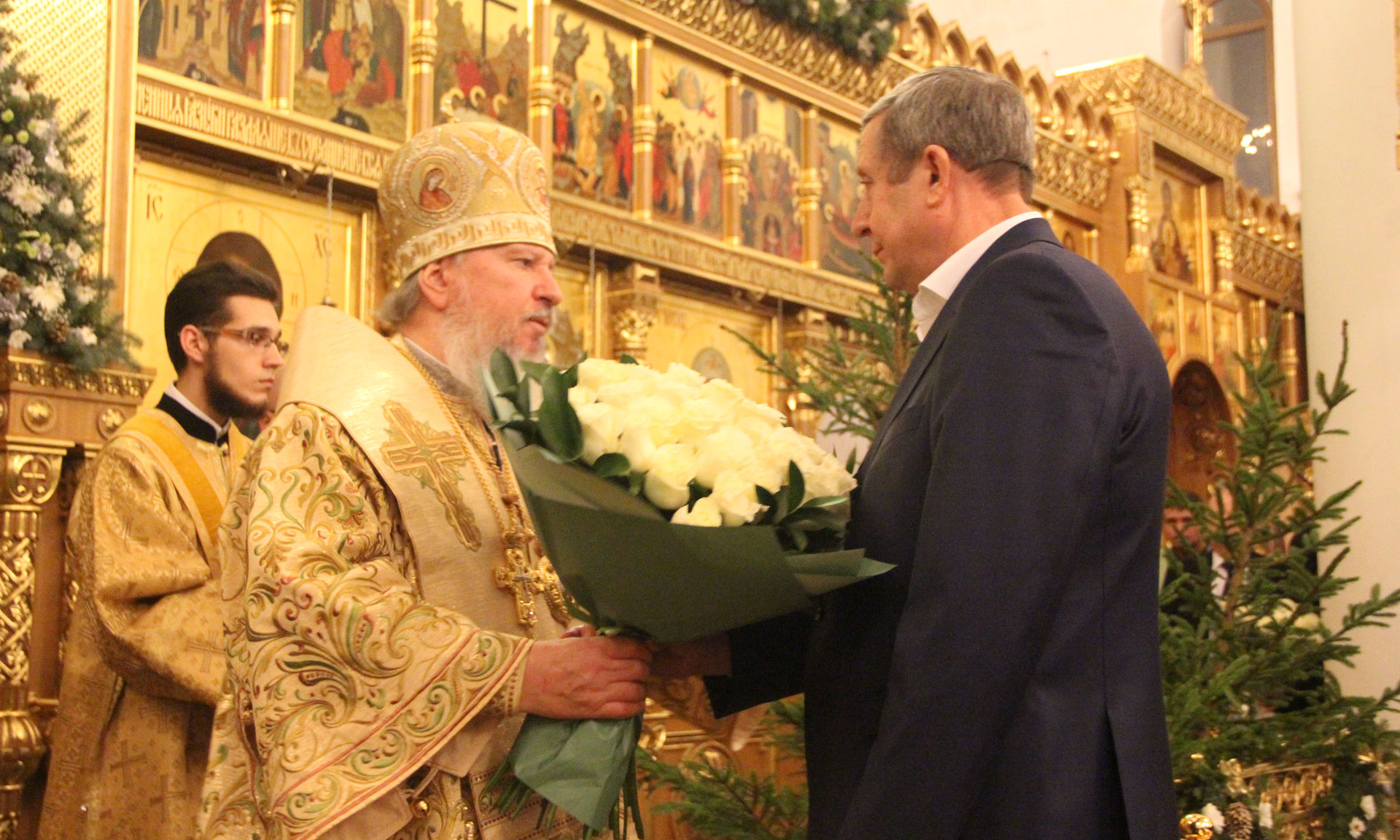 Владимир Попков подарил митрополиту Александру букет белых роз. Всем детям, молившимся за ночной Литургией, были предложены рождественские сладкие подарки.