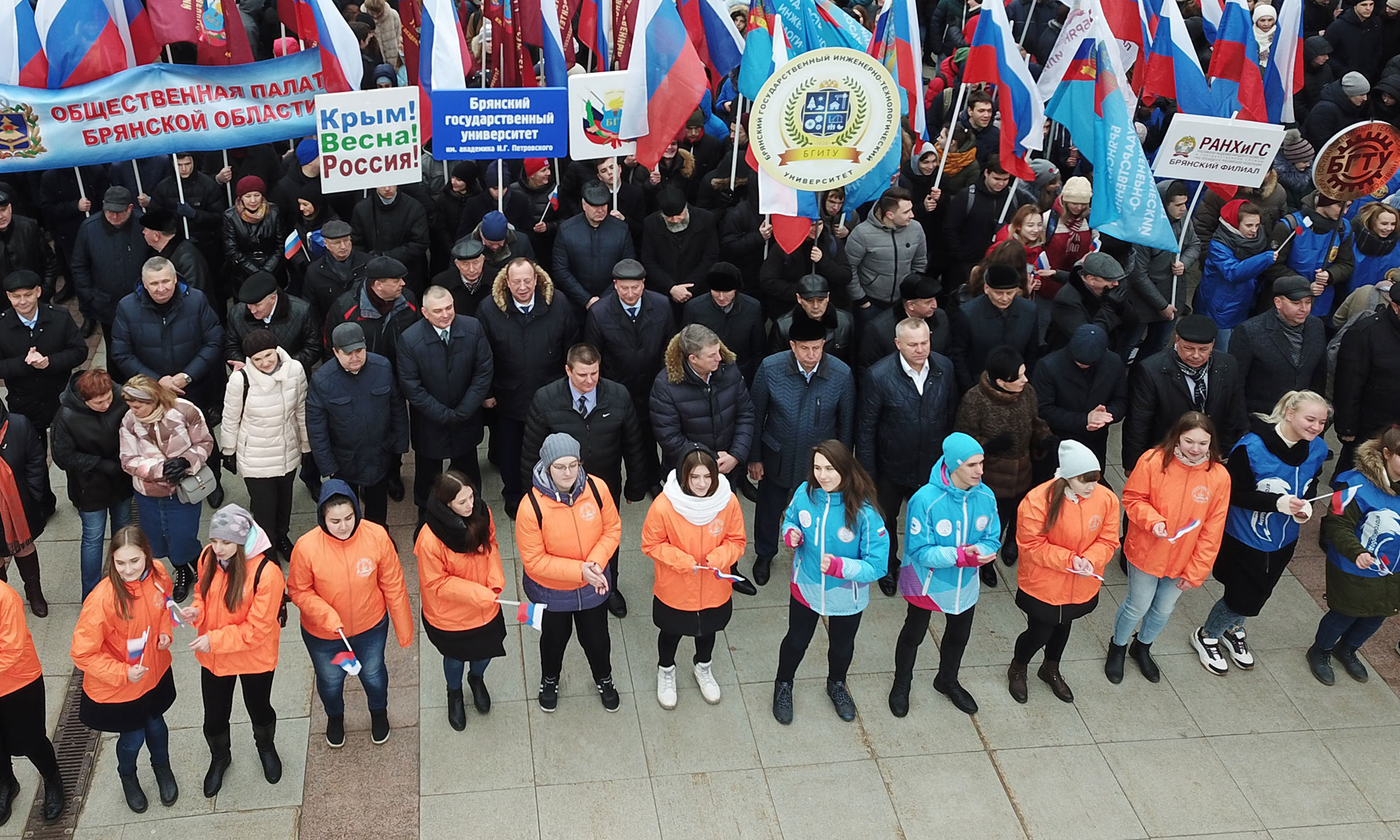 Несмотря на прохладную погоду «Крымская весна» своим теплом объединила несколько тысяч жителей Брянской области: представителей предприятий и организаций, молодежь и студенчество Брянской области, представителей общественных организаций и объединений, руководителей региона, депутатов Государственной Думы Федерального Собрания Российской Федерации, представителей органов исполнительной государственной власти и федеральных территориальных органов государственной власти, депутатов.