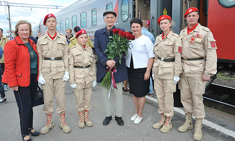 Василия Семеновича Ланового на железнодорожном вокзале встретили директор департамента культуры Брянской области Елена Кривцова и брянские юнармейцы. Почетному гостю вручили букет цветов.