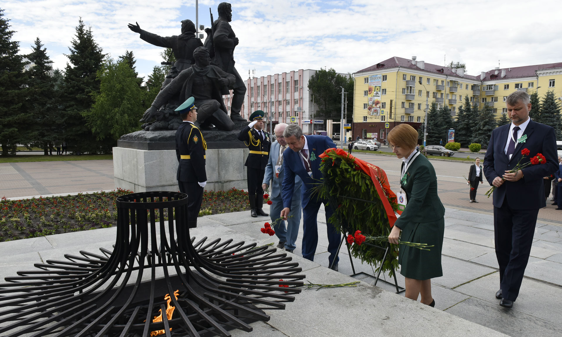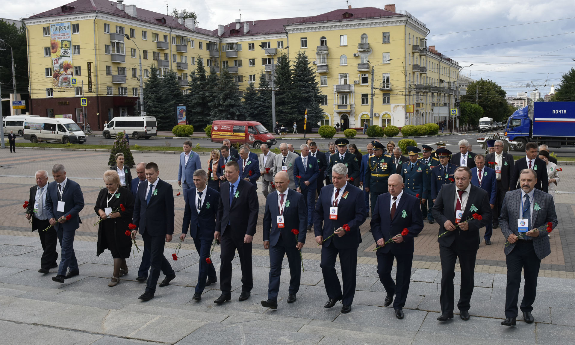 В ритуале возложения цветов и венков к Вечному огню приняли участие Губернатор Брянской области Александр Богомаз, председатель Брянской областной Думы Владимир Попков, главный федеральный инспектор по Брянской области Андрей Дьячук, Герой Советского Союза Иван Кашин, депутаты Государственной Думы Федерального Собрания Российской Федерации Валентина Миронова и Валентин Суббот, председатель Брянского областного суда Евгений Быков, председатель Арбитражного суда Брянской области Евгений Егоров, начальник управления ФСБ России по Брянской области Николай Рудь, начальник управления МВД России по Брянской области Владислав Толкунов, начальник главного управления МЧС России по Брянской области Вадим Уваркин, заместитель начальника правления Федеральной службы войск национальной гвардии Российской Федерации по Брянской области Сергей Сердюк, первый заместитель руководителя следственного управления Следственного комитета Российской Федерации по Брянской области Дмитрий Буравцов, начальник пограничного управления ФСБ России по Брянской области Сергей Митюшин, руководитель управления Федеральной службы судебных приставов по Брянской области — главный судебный пристав Брянской области Елена Бывшева, начальник управления ФСИН России по Брянской области Леонид Сагалаков, заместитель начальника Брянской таможни Мирослав Мильченко, руководитель управления ФНС России по Брянской области Андрей Маркелов, заместители Губернатора Брянской области, руководители города Брянска, депутаты Брянской областной Думы, руководитель Брянского регионального отделения ООО «Ветераны боевых действий России» Вячеслав Губанов, председатель Брянской областной общественной организации Российского союза ветеранов Виктор Андреев, председатель Брянского регионального общественного движения военно-патриотических и поисковых организаций «Отечество», организатор шествия Общероссийского общественного гражданско-патриотического движения «Бессмертный полк» Александр Соболев, командир в/ч 55443-БМ Игорь Дубинкин, руководитель исполнительного комитета регионального отделения Общероссийского общественного движения «Народный фронт «За Россию» в Брянской области Лариса Третьякова, сопредседатель регионального штаба регионального отделения Общероссийского общественного движения «Народный фронт «За Россию» в Брянской области Валерий Родоманов, член правления РОО «Брянское землячество» Александр Борода, член РОО «Брянское землячество в г. Москва» Игорь Демиденко, секретарь Брянской Епархии о. Павел (Чикалин).